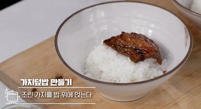 8) 조린 가지를 밥 위에 얹어주면 가지요리 덮밥이 완성됩니다.