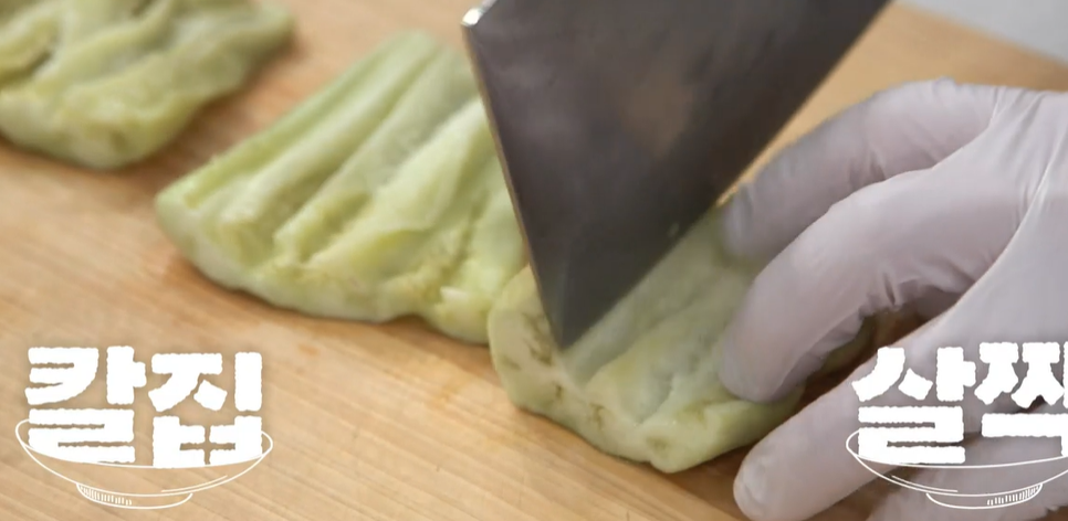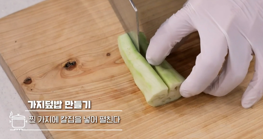5) 부드럽게 잘 익은 가지는 칼집을 넣어 펼쳐줍니다. 이때 칼집을 깊이 넣으면 가지가 물러지거나 분리될 수 있기 때문에 칼집은 살짝 넣어줘야 합니다.
