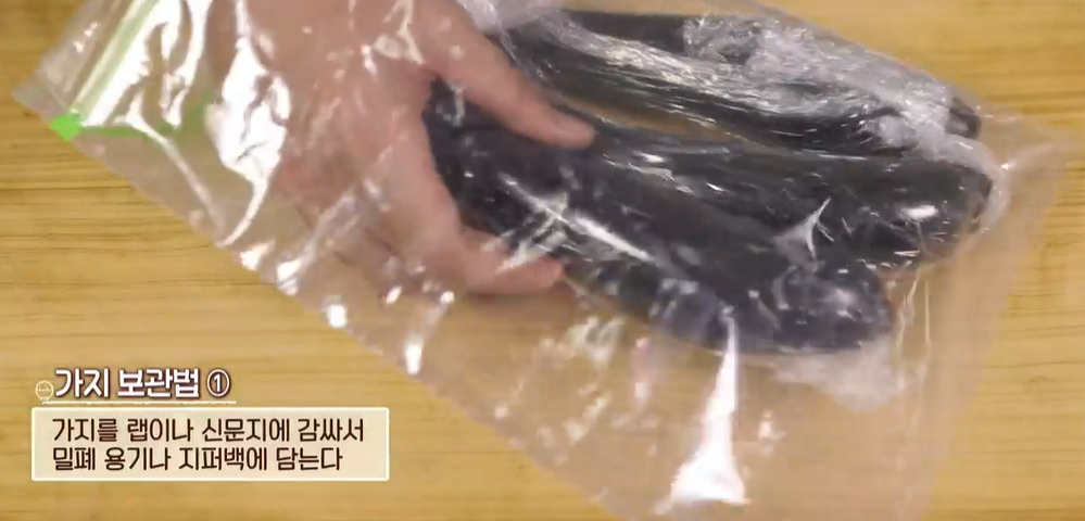 1) 요리하고 남은 가지는 랩이나 신문지에 감싸서 밀폐 용기나 지퍼팩에 담아줍니다.
