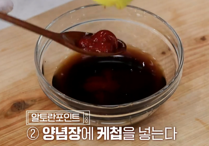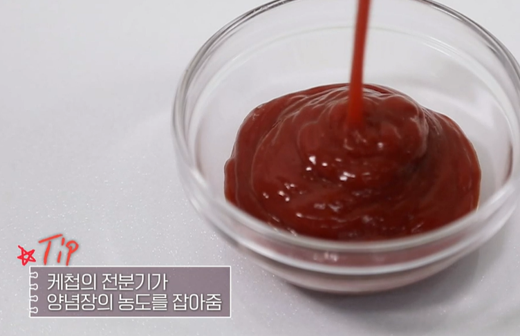 2) 가지요리 양념장에 케첩을 넣어 색감을 살리고 달콤한 맛과 걸쭉한 맛을 잡는다.