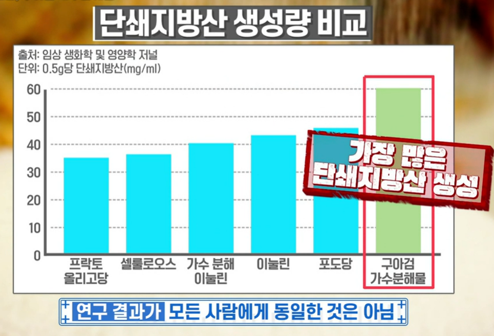 실제로 단쇄지방산 생성량을 비교했을 때 프락토올리고장, 셀룰로오스, 가수 분해 이눌린, 이눌린, 포도당에 비해 구아검 가수분해물에서 가장 많은 단쇄지방산이 생성되었음을 확인했습니다.