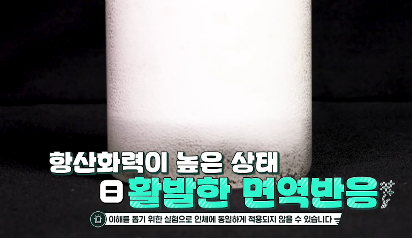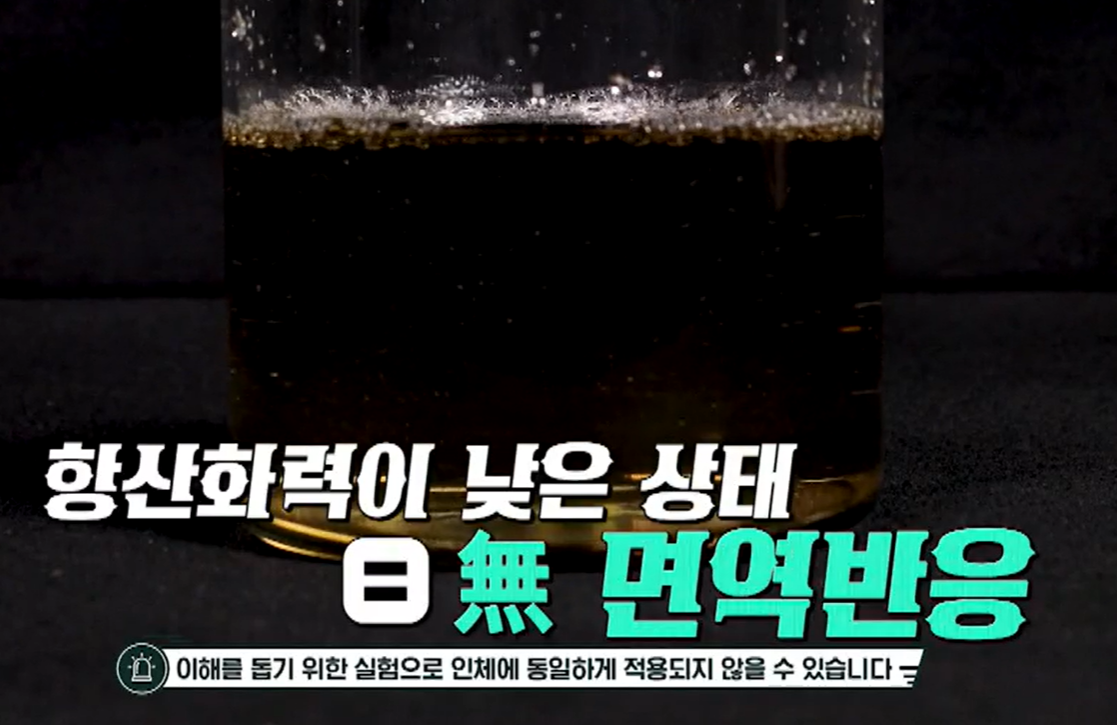 이때 우리 몸을 공격하는 활성산소가 체내로 유입되면 항산화력이 낮은 몸은 활성산소를 방어하지 못해서 아무런 반응이 일어나지 않은 반면 항산화력이 높은 몸은 체내 면역세포가 활발한 움직임을 보이면서 큰 폭발적인 반응이 일어나는 걸 확인할 수가 있습니다.