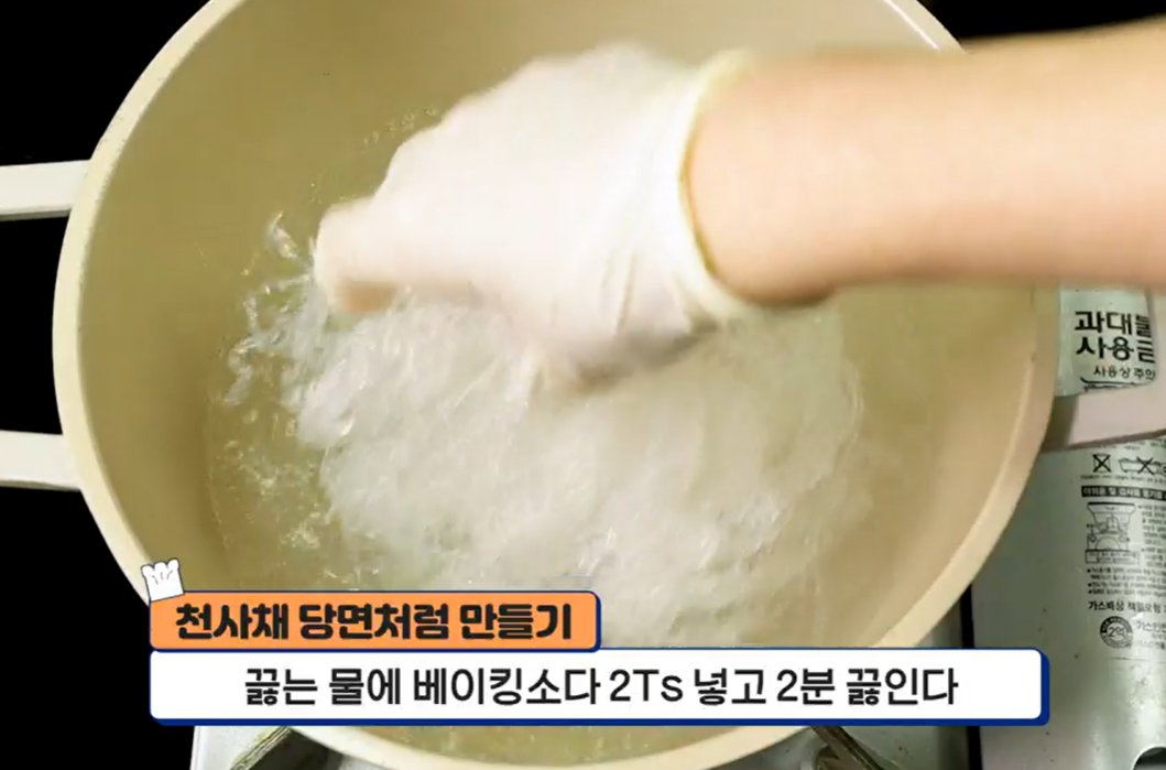 1) 끓는 물에 천사채를 넣고 베이킹소다 2 티스푼을 넣어 2분 정도 끓입니다.(베이킹소다를 너무 많이 넣으면 안 됩니다.)