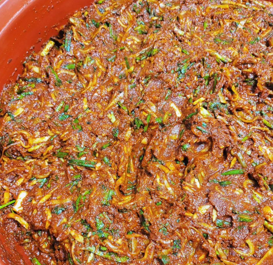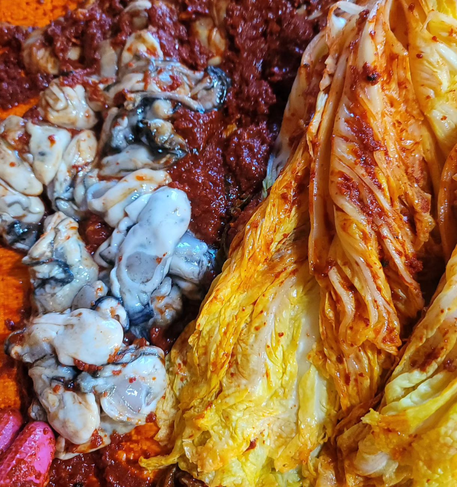 4) 멸치액젓, 꿀, 생새우, 생강, 간 마늘, 고춧가루, 찹쌀풀을 다 넣고 버무려 줍니다.