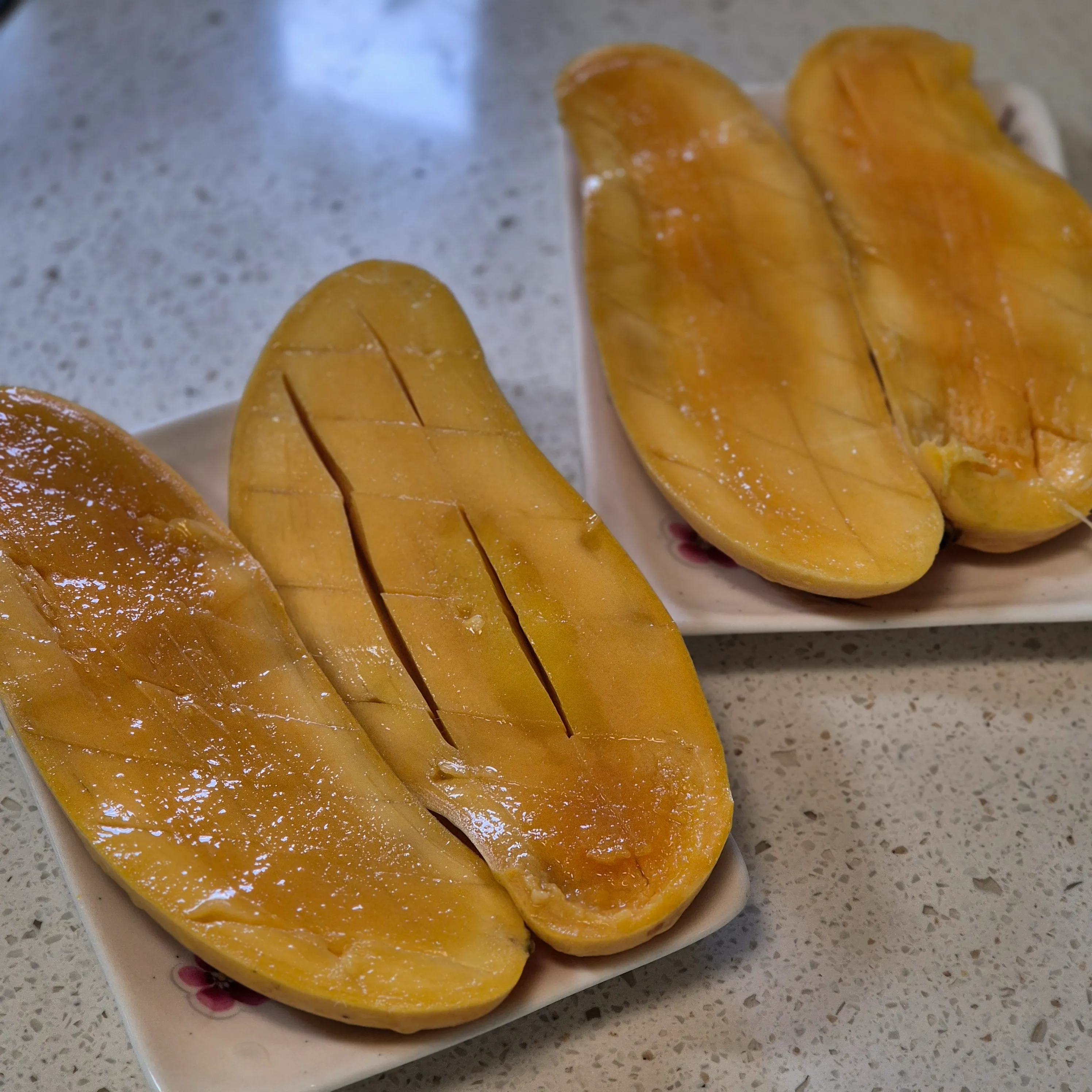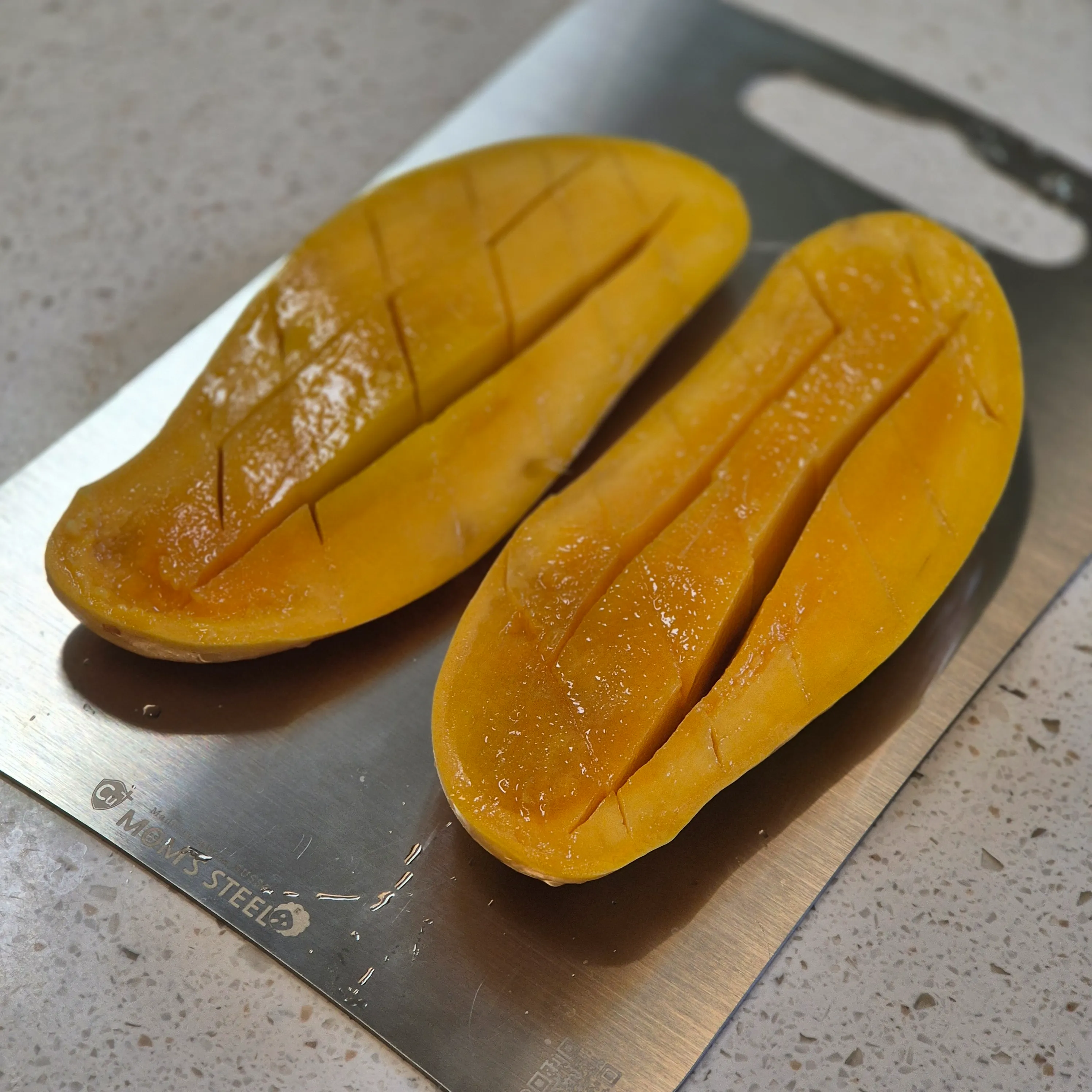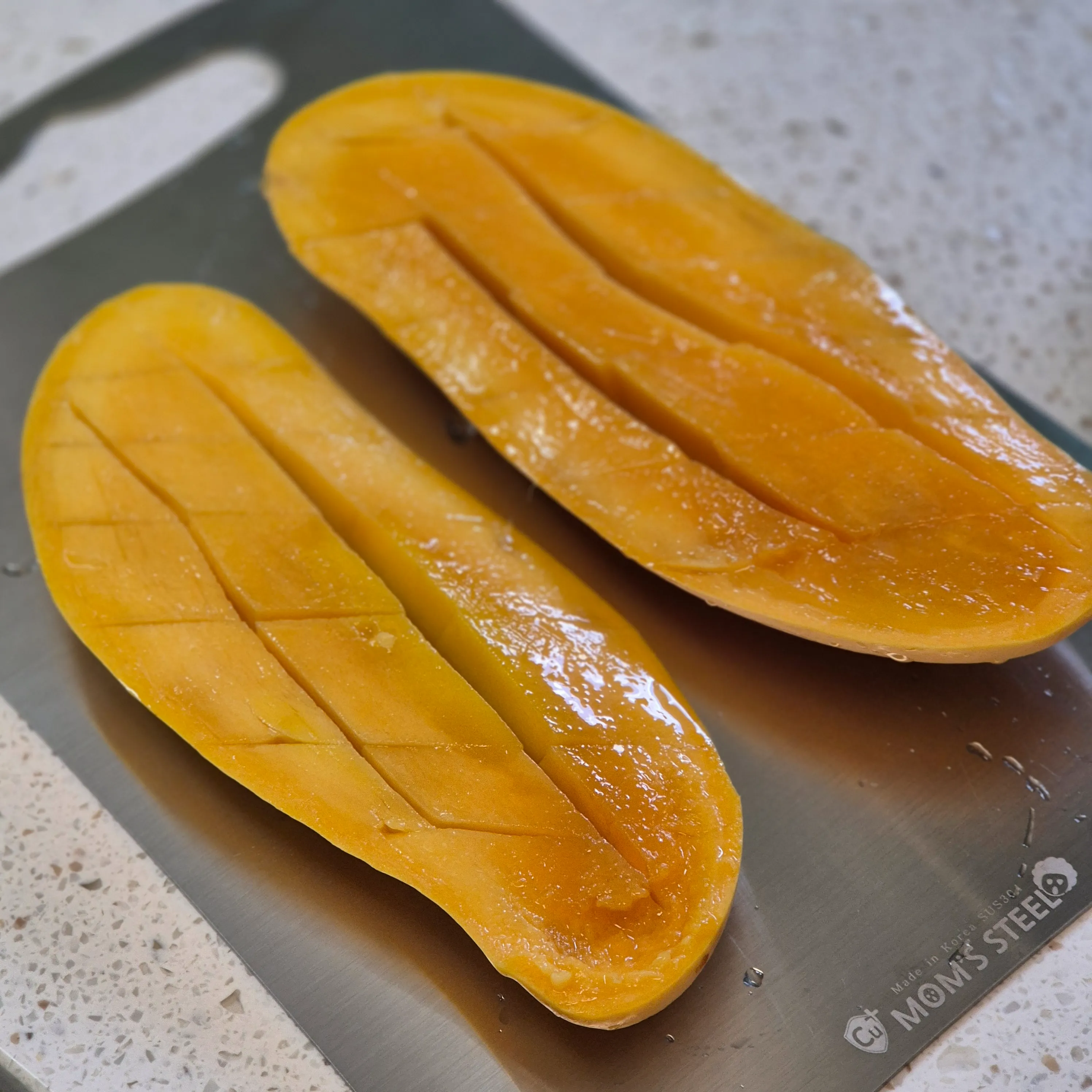 자른 큰 조각의 망고 과육은 껍질 쪽 반대 방향에서 칼을 사용해 격자 모양으로 자른 다음, 뒤집듯이 벌려주면 과육을 쉽게 떼어낼 수 있습니다. 이때 쇠 스푼을 사용하면 과육을 좀 더 편하게 분리할 수 있습니다. 망고의 씨 부분도 가능한 한 과육을 남기지 않도록 주의해서 자르세요.
