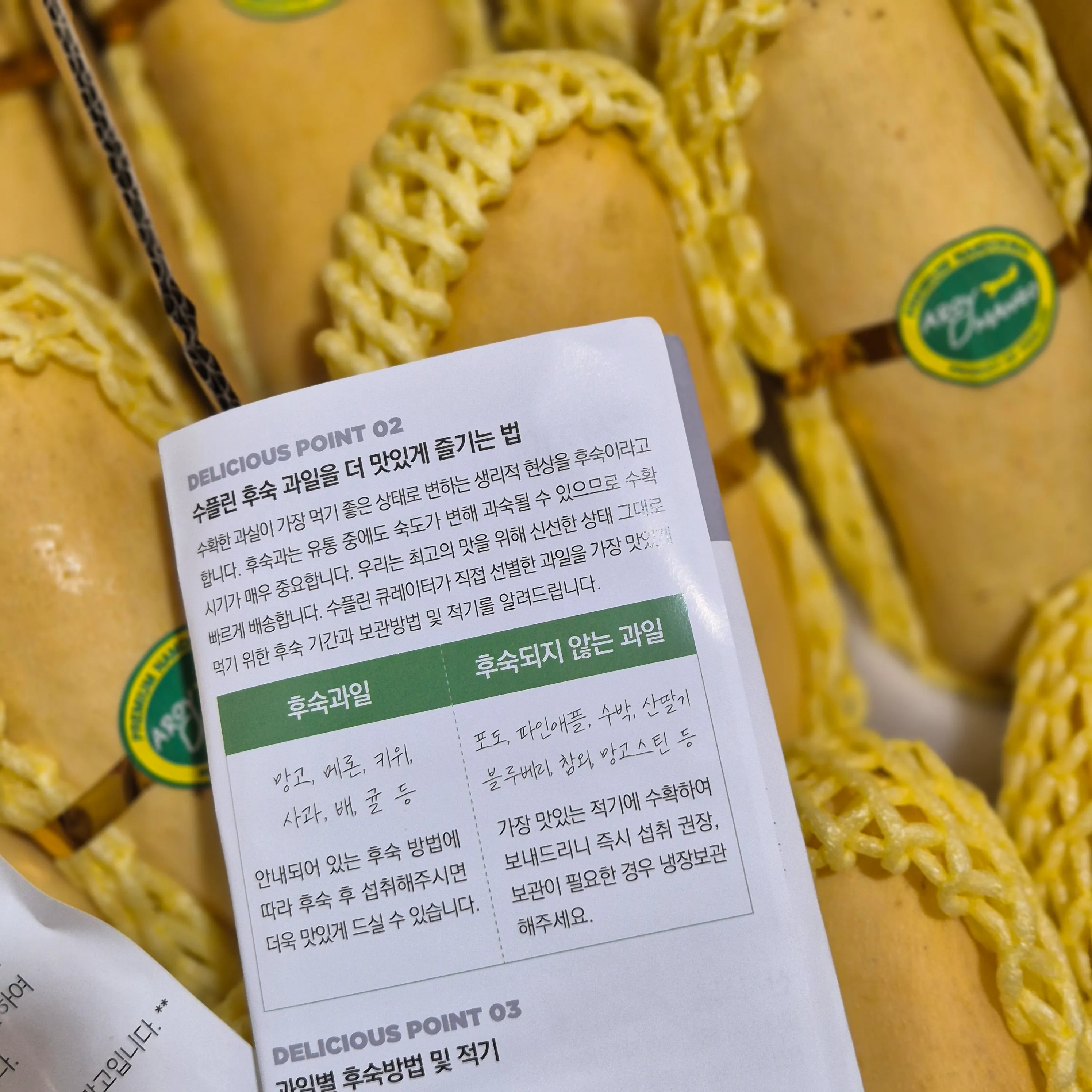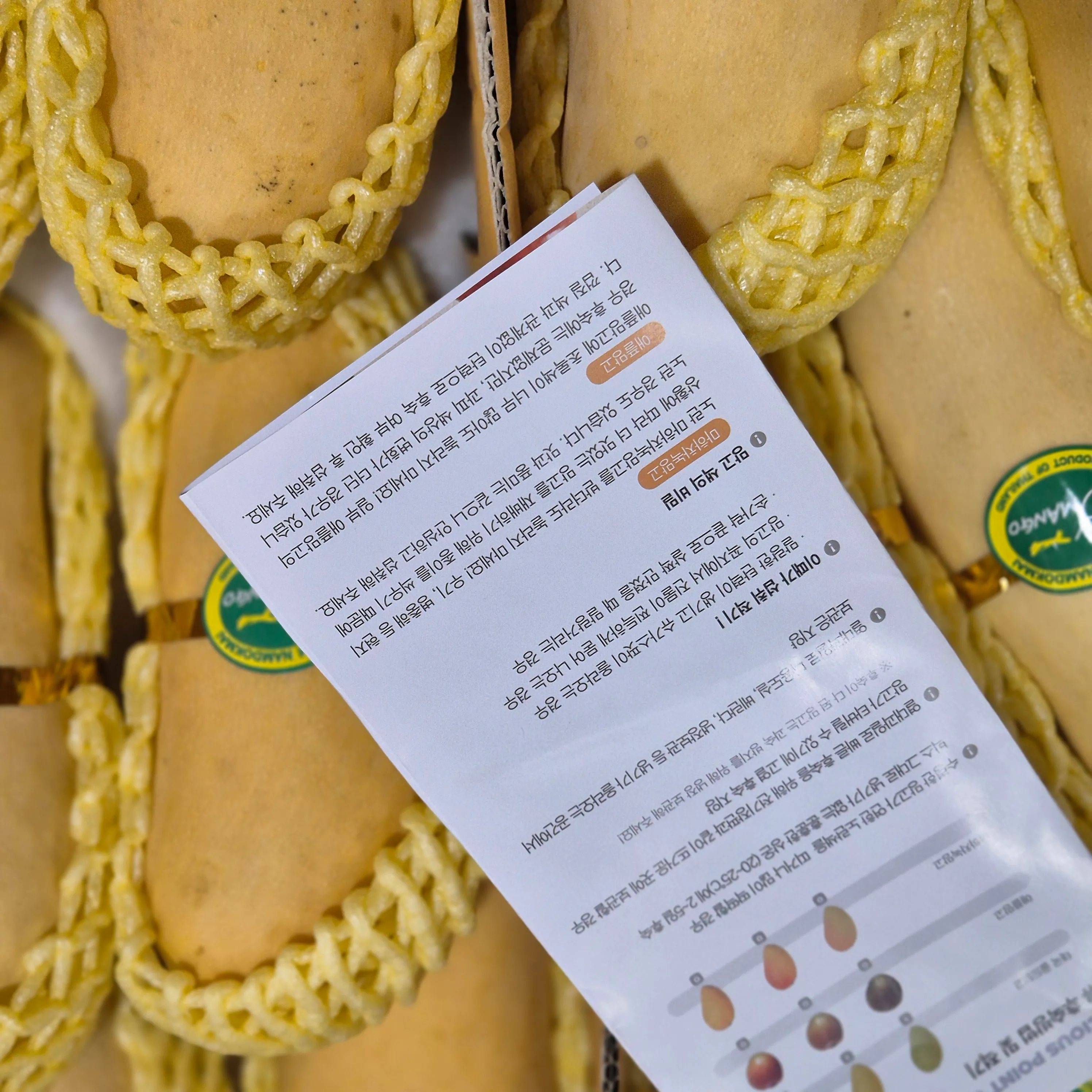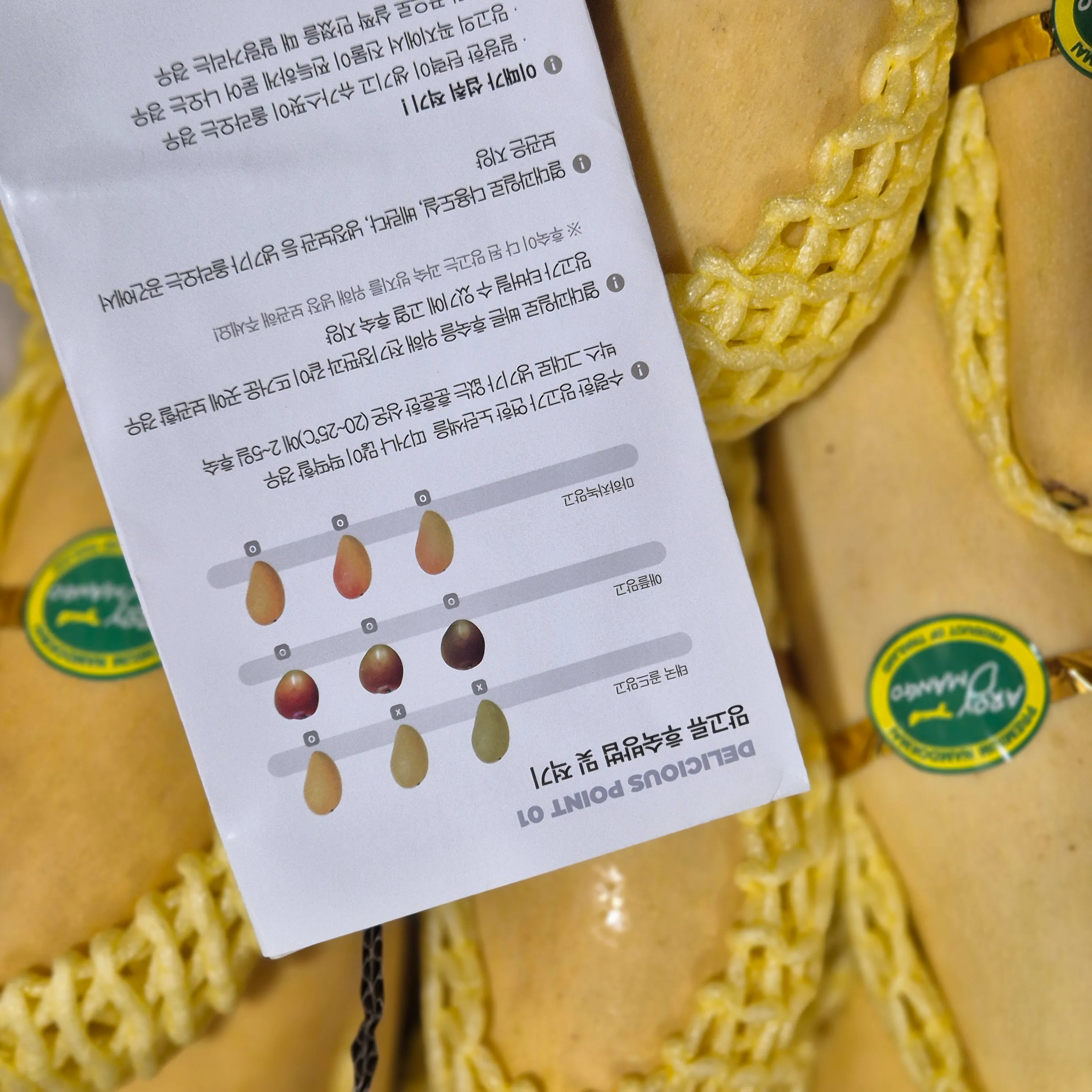 잘 익은 망고는 꼭지 부분에서 달콤하고 상큼한 향기를 풍깁니다. 향이 전혀 나지 않는다면 덜 익은 망고이고, 발효된 냄새나 알코올향이 나면 과숙된 것이니 주의해야 합니다. 향기를 맡아보는 것도 중요한 선택 기준이 됩니다.