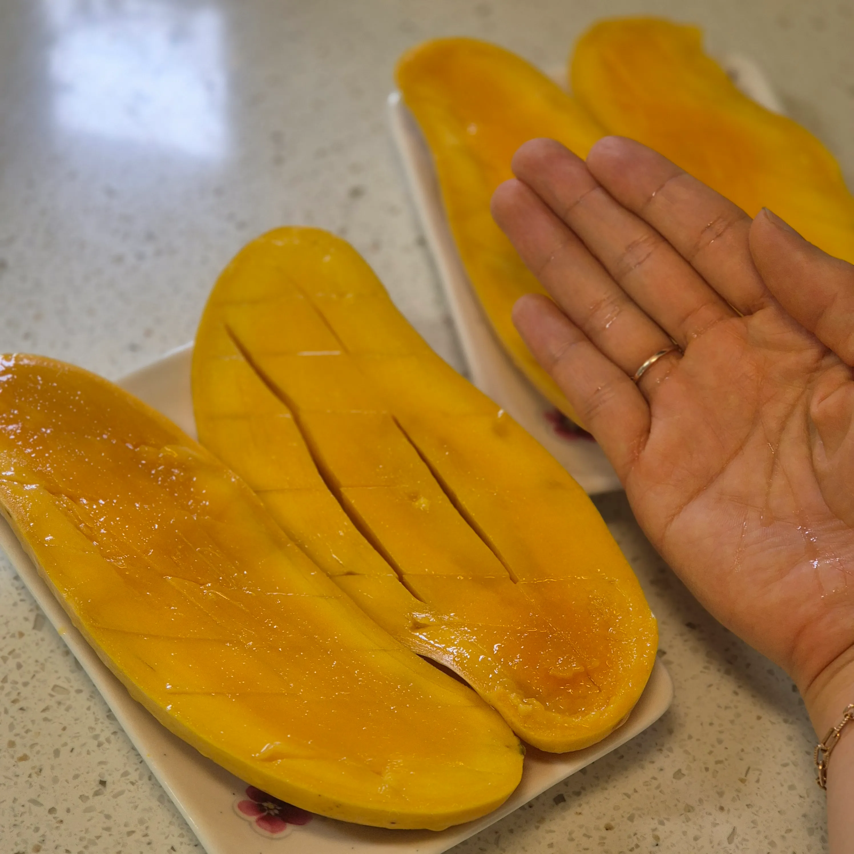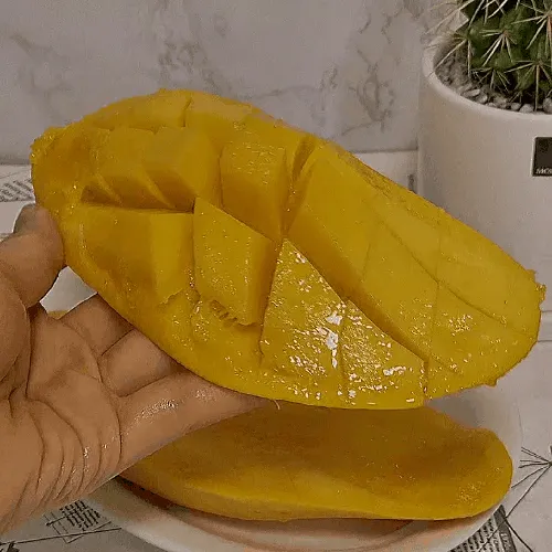 망고를 손으로 살짝 눌러보세요. 너무 단단하면 아직 덜 익은 것이고, 너무 물렁하면 과숙한 상태일 수 있어요. 적당히 부드럽고 탄력이 느껴지는 것이 가장 좋은 상태의 망고랍니다. 손으로 눌렀을 때 적당한 저항감이 있는 망고를 선택하세요.