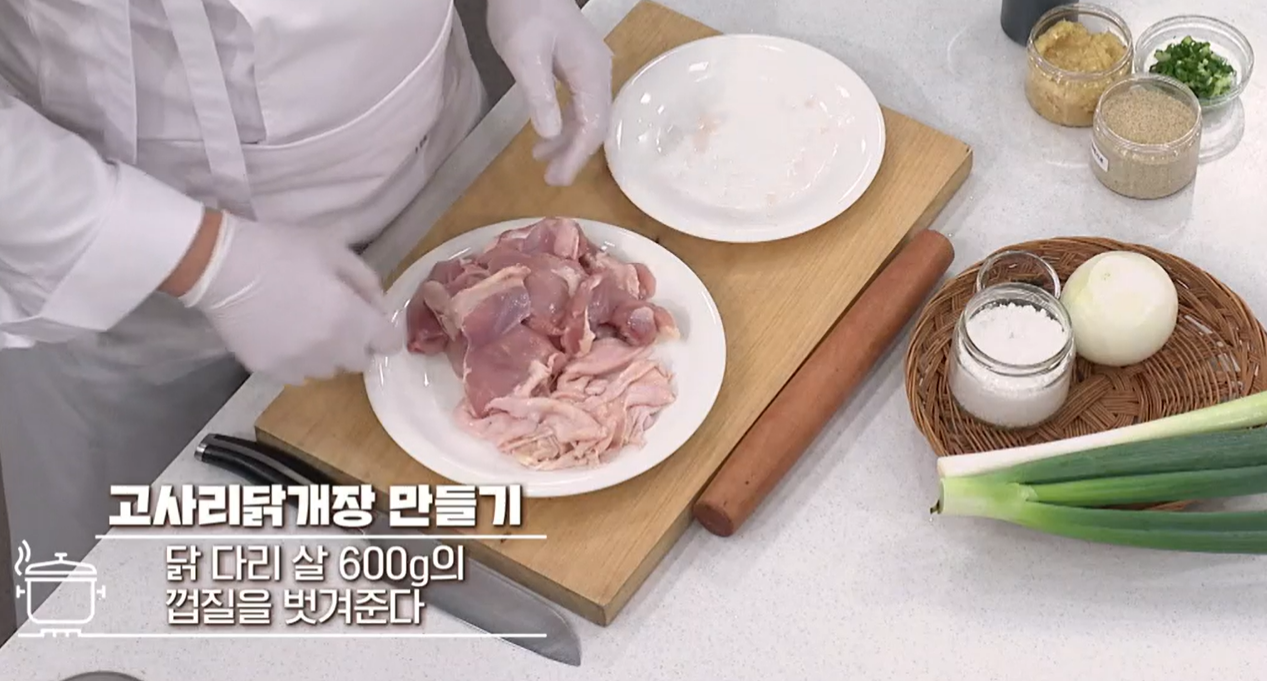 1) 닭개장 맛있게 끓이는 법을 위해 닭고기 600g의 껍질은 제거해 주는 것이 좋습니다. 그래야 담백하고 깔끔한 닭개장 육수를 만들 수 있기 때문입니다.