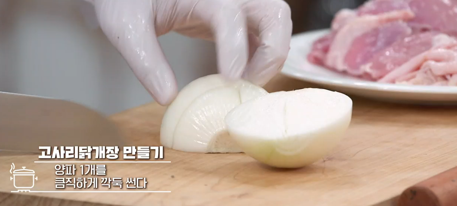 2) 고사리 닭개장에 들어갈 양파 1개를 큼직하게 깍둑 썰어줍니다.