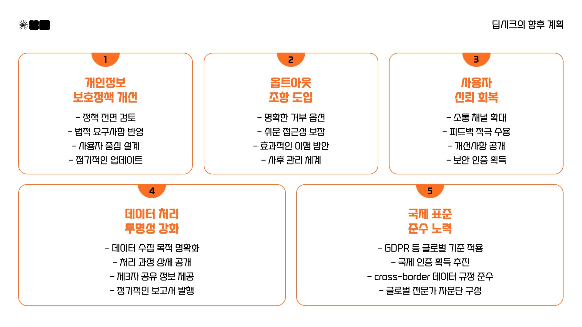 딥시크는 앞으로 개인정보 보호법을 준수하기 위해 정책을 개선하겠다고 했지만, 과연 옵트아웃 조항이 포함될지는 아직 확실하지 않아요.