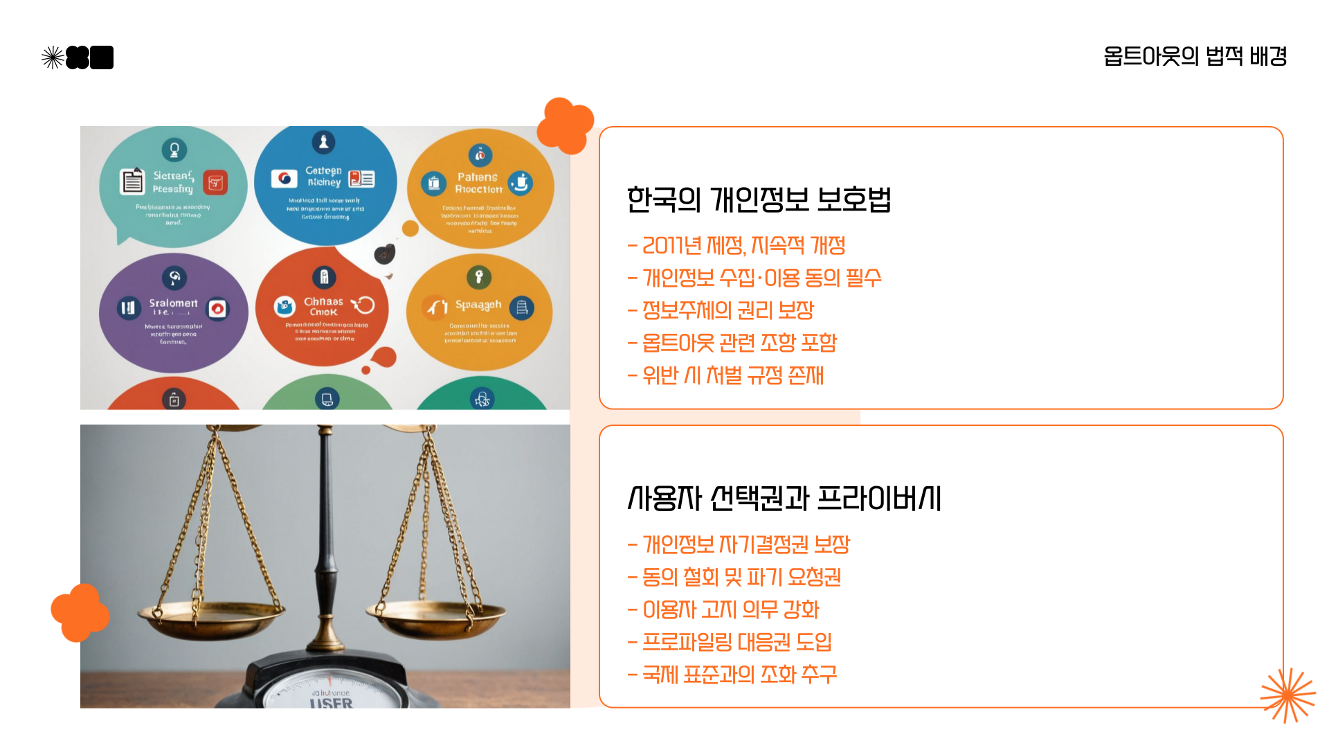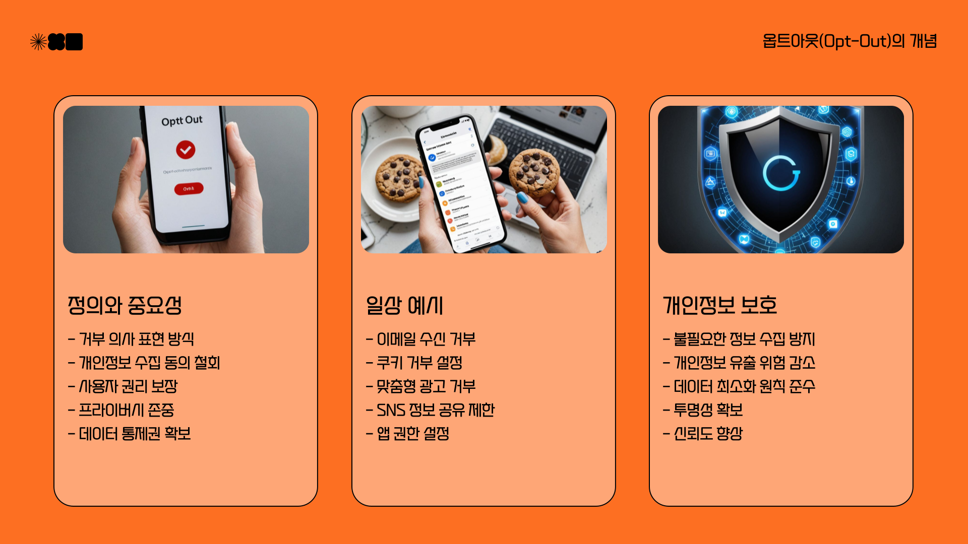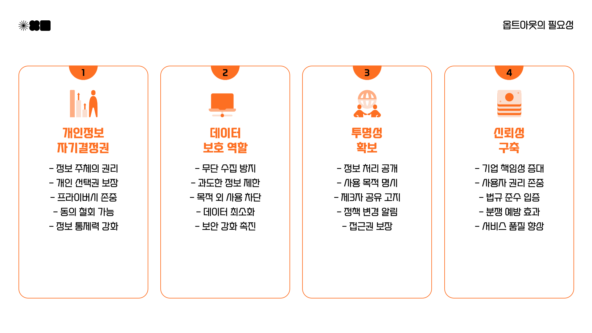 옵트아웃은 여러분이 자신의 개인정보를 스스로 지킬 수 있는 중요한 권리예요. 여러분은 자신의 데이터가 어떻게 사용될지를 알고 싶어하고, 이에 대한 선택권이 있어야 하죠.