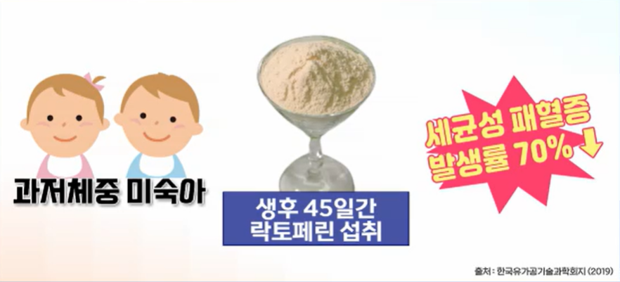 실제 한 연구 따르면 과저체중으로 태어난 미숙아에게 생후 45일 동안 락토페린을 섭취하게 했더니 세균성 패혈증 발생률이 70%가 감소했다는 보고도 있습니다.