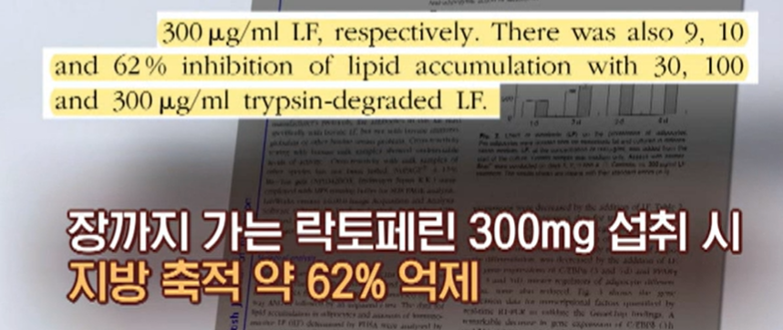실제로 한 동물 실험에서 ml당 300 마이크로 농도의 락토페린을 7일 동안 공급했더니 일반 락토페린은 효과가 없었던 반면에 장용성 락토페린은 지방 축적을 최대 62%까지 억제할 수 있었다고 합니다.