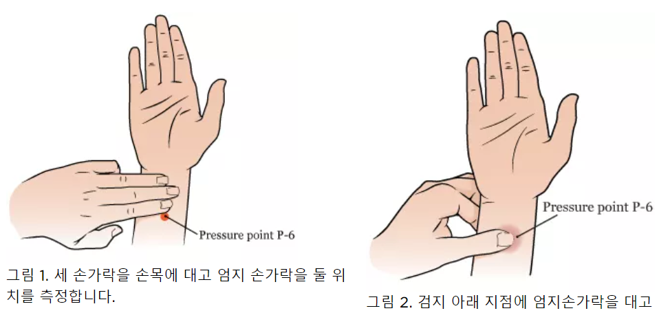 손목 근처 팔 안쪽에 위치한 내관이라는 경혈점을 자극하며 지압하면 메스꺼움이 완화되고 구토를 예방할 수 있습니다.