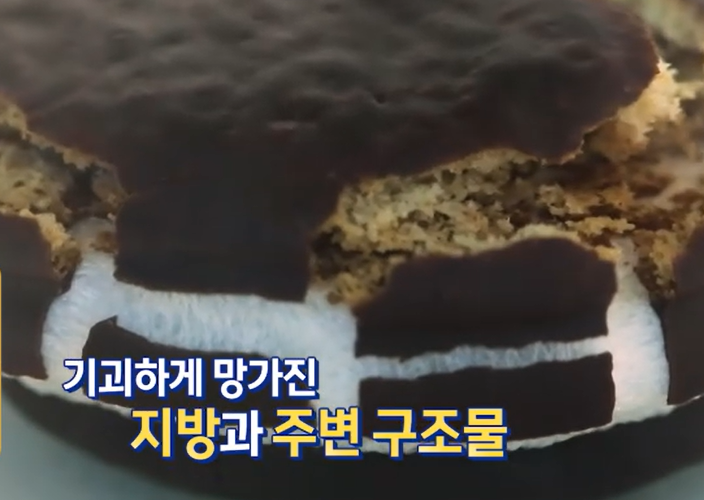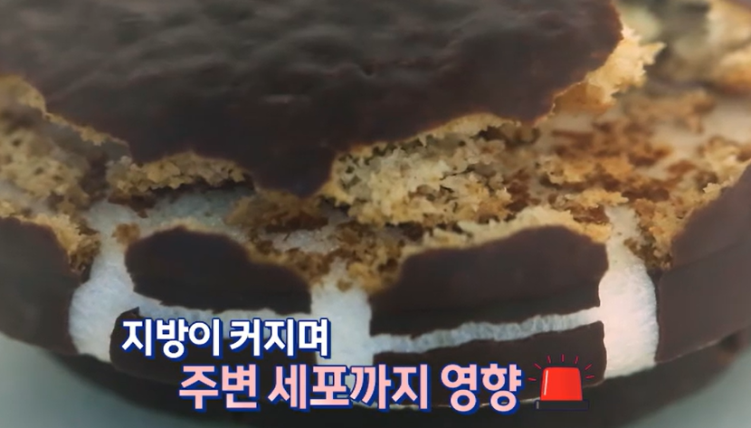 만약에 초코파이를 지방이라고 가정했을 때 진공 용기에 넣고 공기를 빼면 지방이 부풀면서 색이 망가지고 염증을 일으켜 더욱 살을 빼기 힘든 몸 상태가 되었다고 볼 수 있습니다.