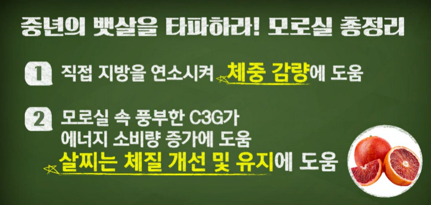 모로실이 체중 감량에 도움을 줄 수 있었던 건 다이어트를 돕는 핵심 성분인 C3G가 풍부했기 때문입니다. C3G 성분은 우리 몸속 내장지방을 쌓는 백색 지방을 갈색 지방으로 전환시켜서 에너지 소비를 돕고, 살이 빠지는 체질을 만드는 데 효능이 있는 것으로 알려져 있습니다.
