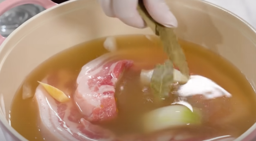 그다음 물은 1L 정도 넣고, 잘라 놓은 생강과 월계수 잎을 넣은 뒤 대파를 넣어줍니다. 소주는 선택 사항이지만 100ml 정도 넣어주면 더욱 향긋하고 깔끔하면서 부드러운 보쌈 고기의 맛을 느낄 수 있습니다. 이렇게 준비한 재료를 모두 넣었다면 뚜껑을 닫고 약 50분 정도 푹 삶아주면 보쌈 고기 삶는 과정이 끝이 납니다.