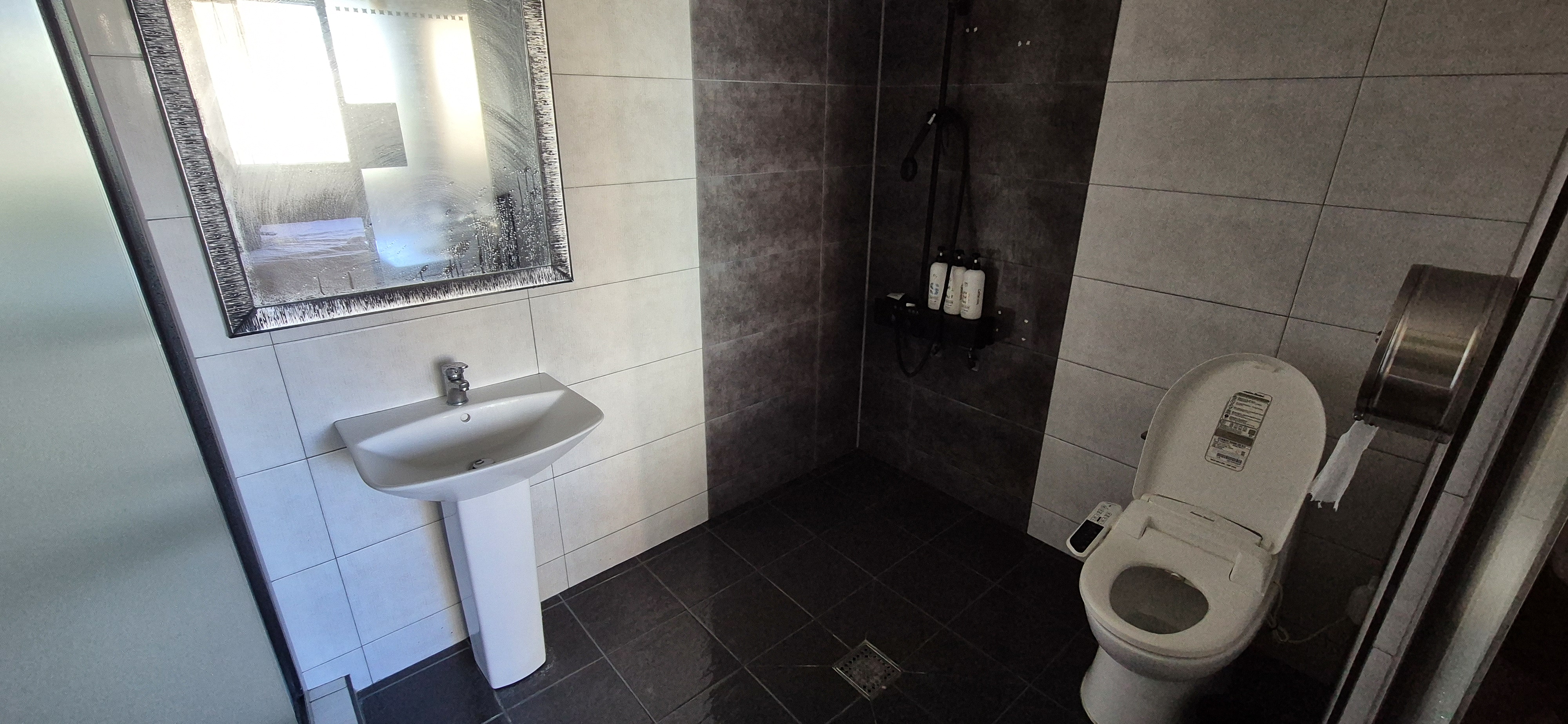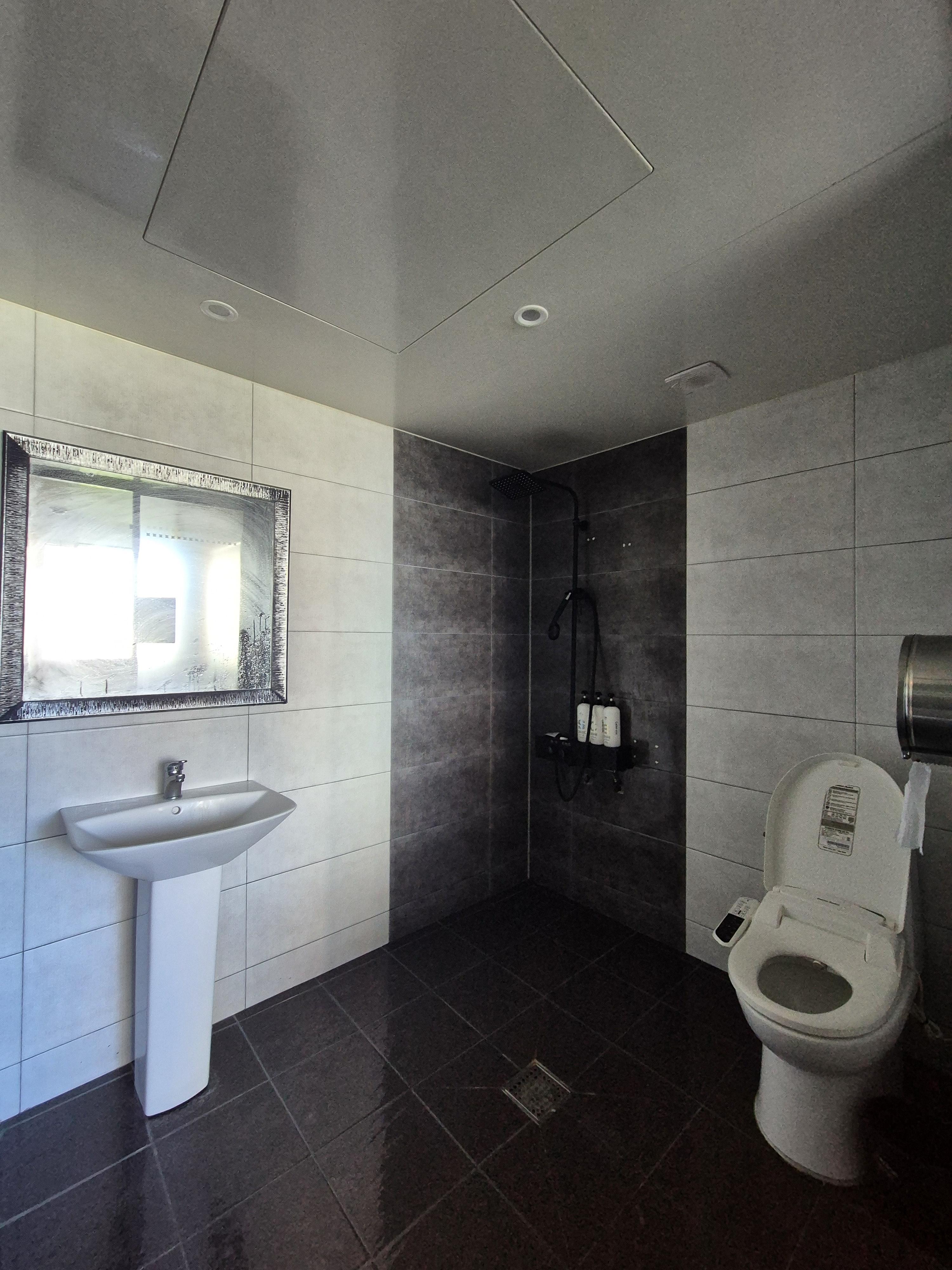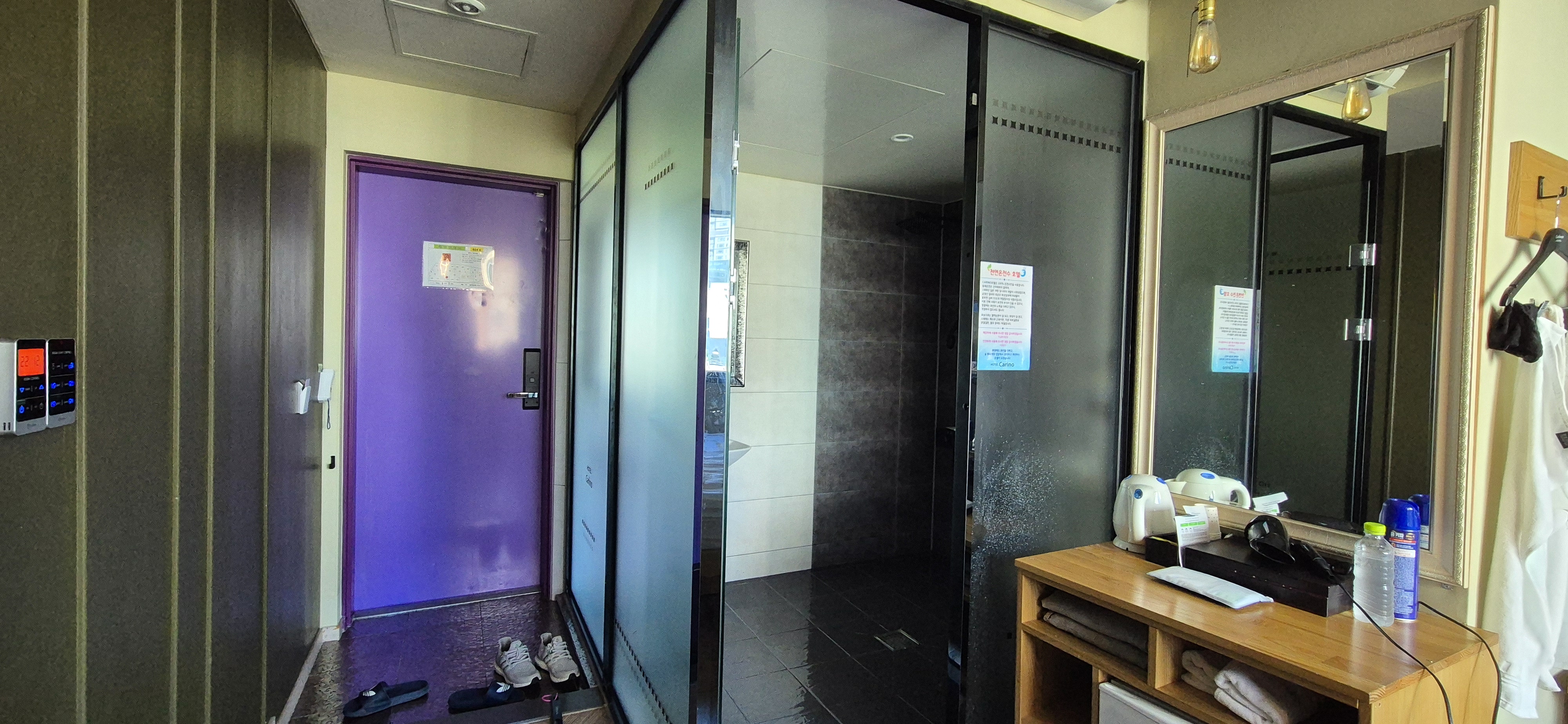 보라색 현관문 옆으로 화장실이 있었는데 아쉽게도 저희가 묵은 호실에는 욕조가 없었어요. 있었다면 온천수에 반신욕이라도 했을텐데 말이에요.