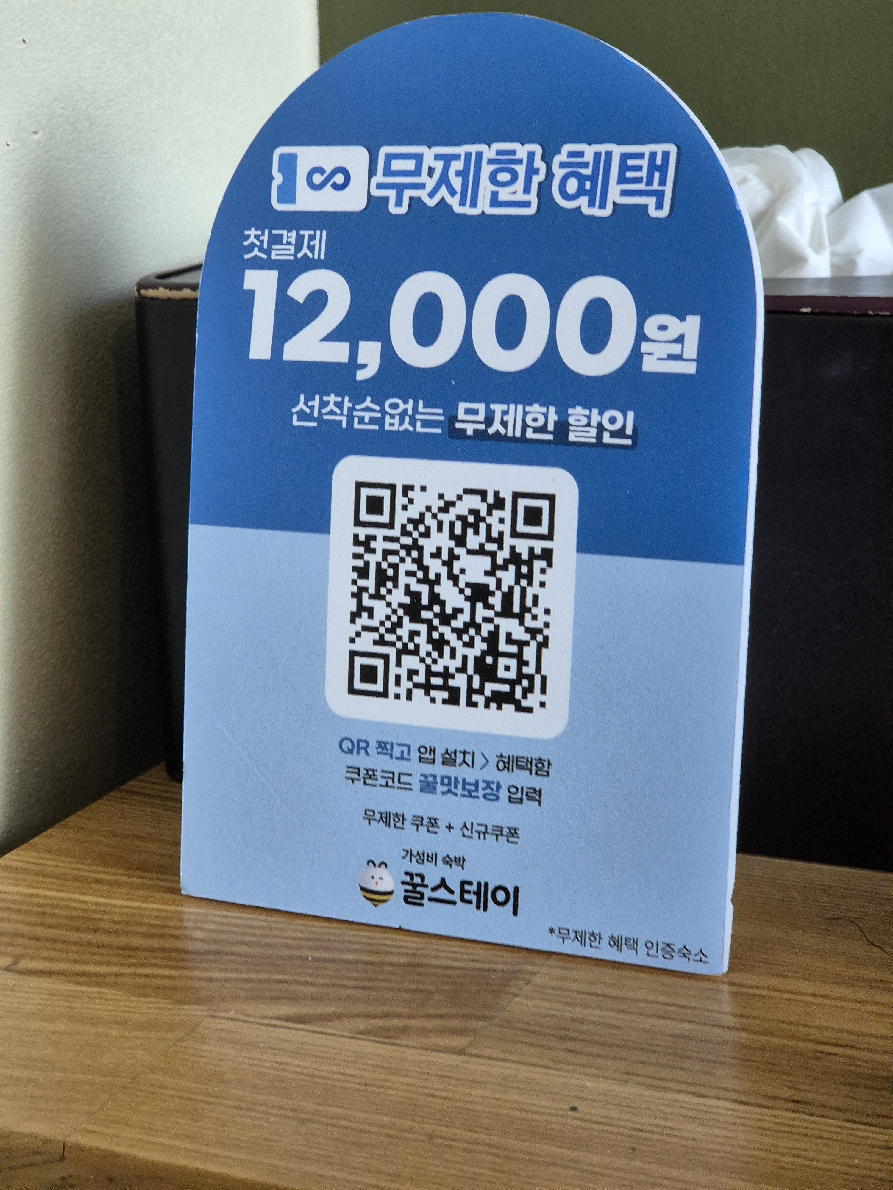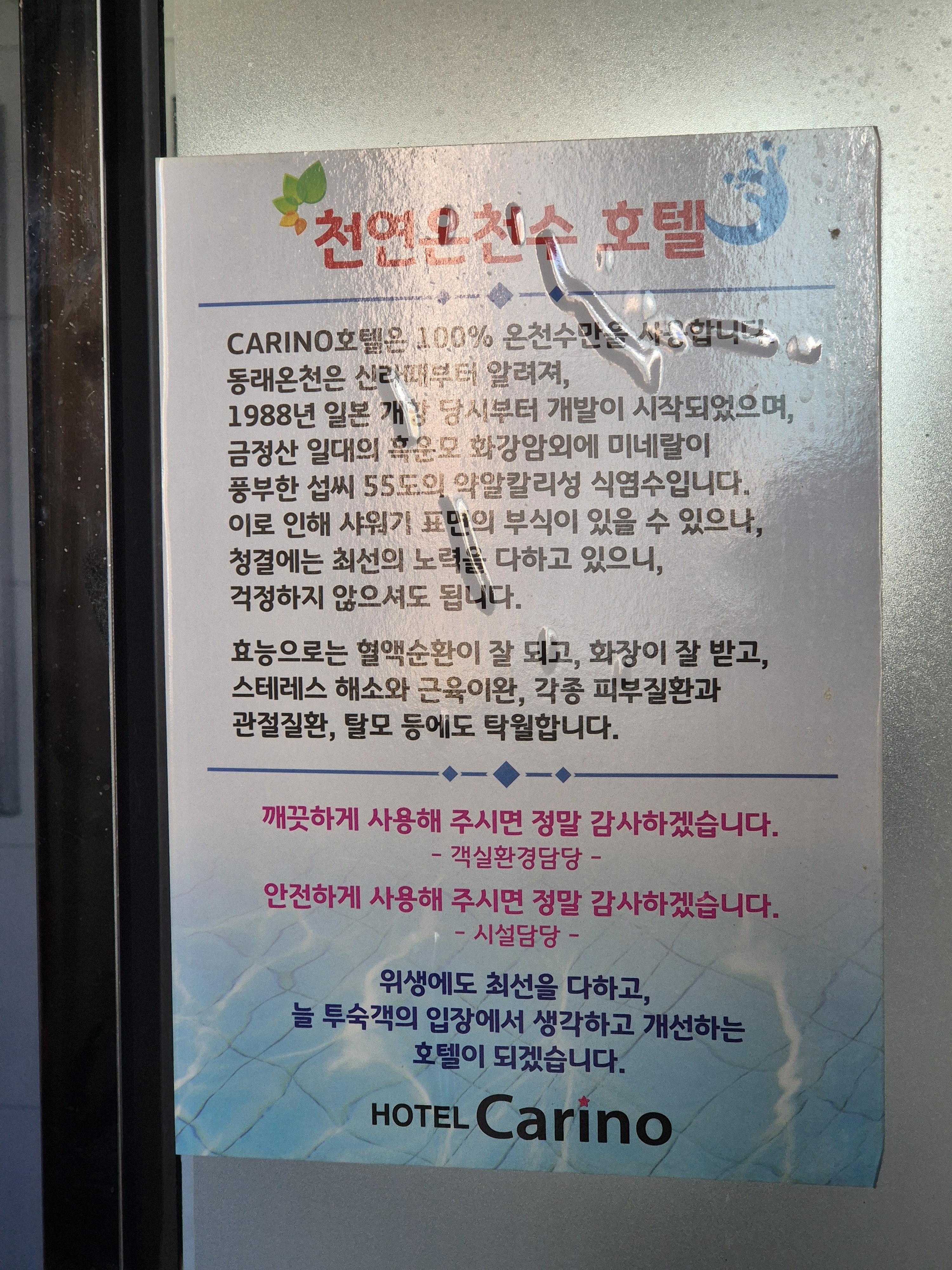 꿀스테이라는 가성비 숙박 어플에서는 선착순 없는 무제한 할인도 진행하나본데 지금도 하고 있는지는 모르겠네요. 1층 입구와 화장실 옆에 천연온천수 호텔이라며 부산 동래구 온천장 숙소의 장점인 온천수 효능이 적혀있었어요.