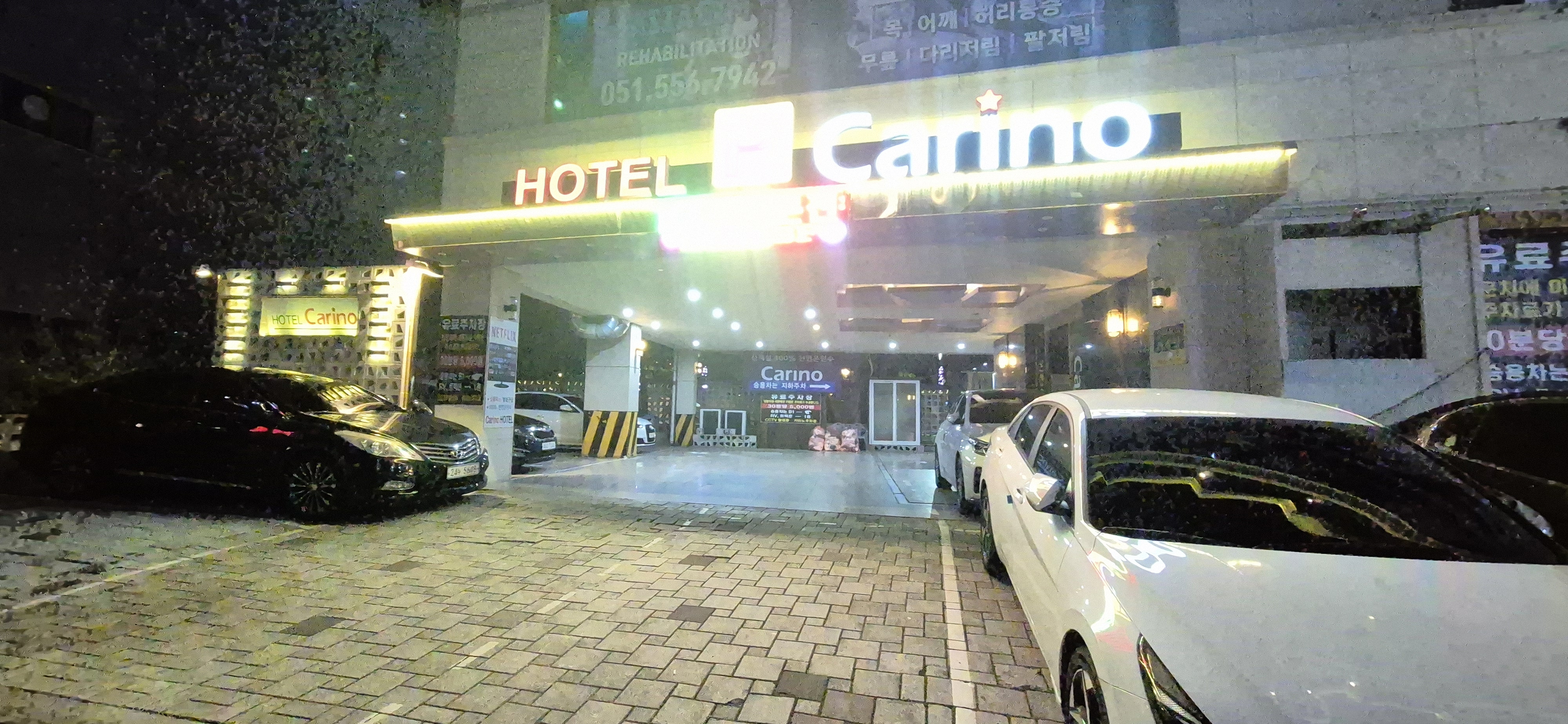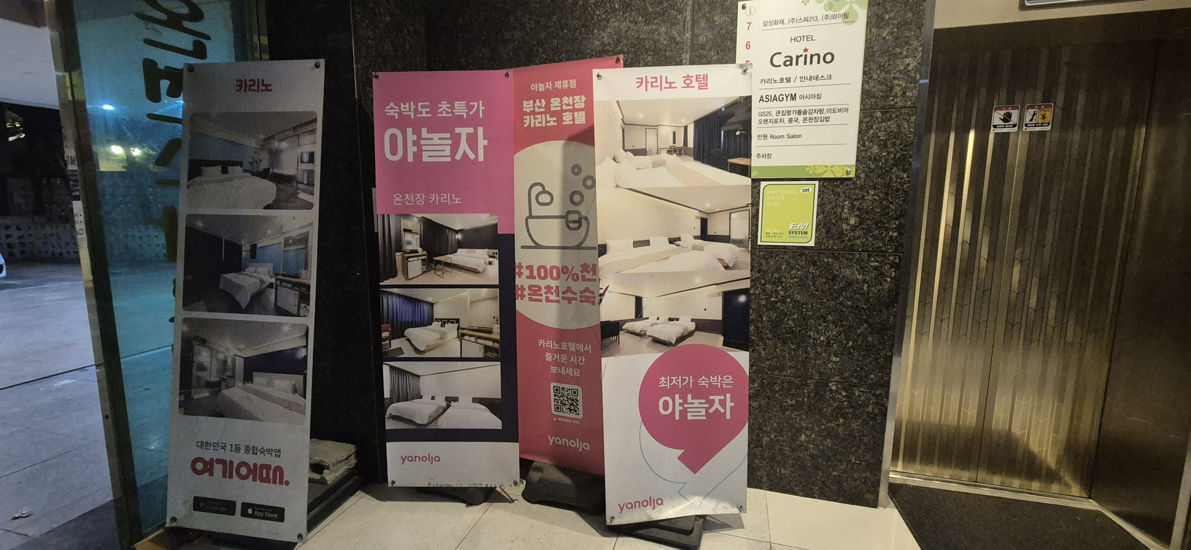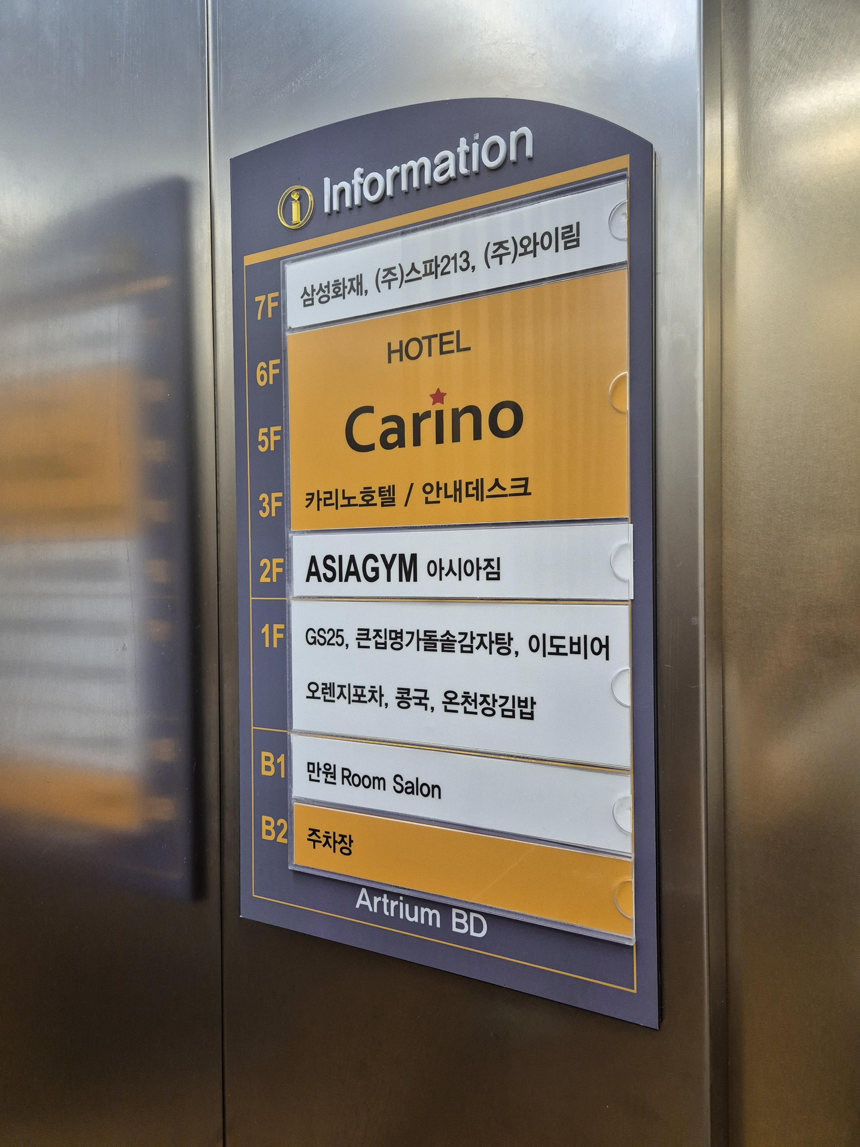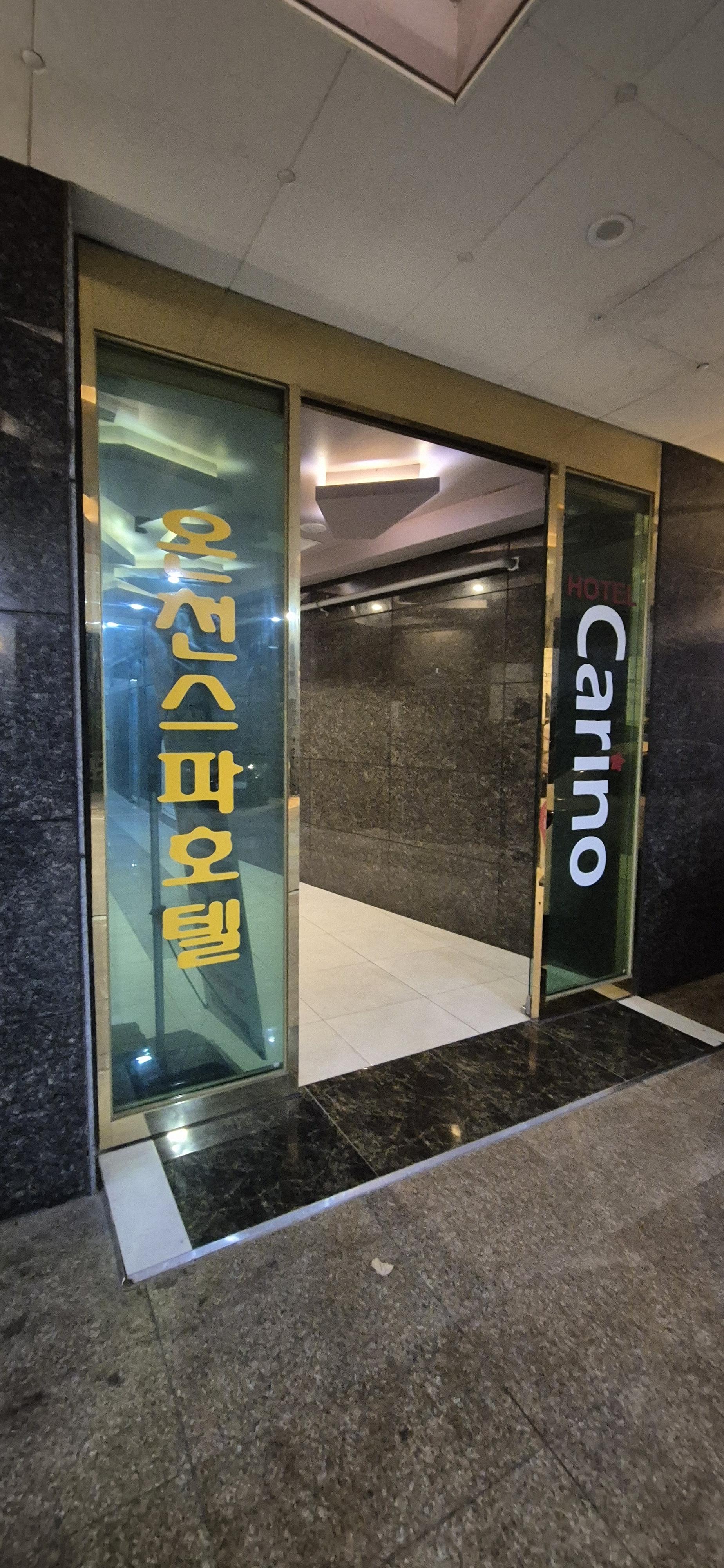 한글 간판은 없고 영어로 호텔 카리노(HOTEL CARINO)라고 적혀있고, 도보로 이용한다면 입구 쪽 온천스파호텔이라고 적힌 곳으로 쭈욱 들어가면 엘리베이터가 나와요.
