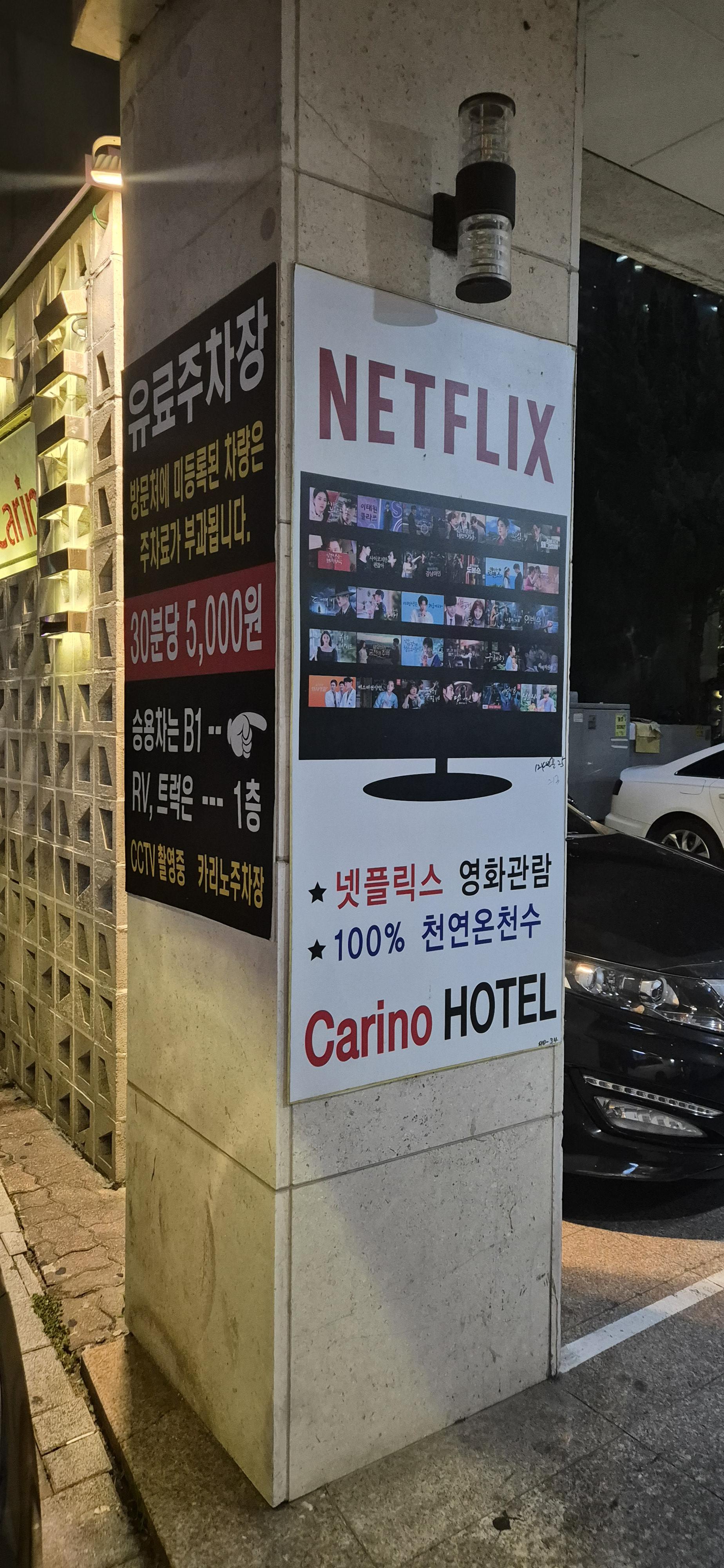 방문처에 미등록된 차량이라면 30분당 5,000원이라는 주차료가 부과되니 참고해주시구요~ 전 객실에서 넷플릭스 영화 관람을 할 수 있는데다 100% 천연 온천수가 나오는 곳이라서 부산 동래구 쪽 다른 지역 모텔이나 호텔보다는 훨씬 씻기가 좋더라고요.