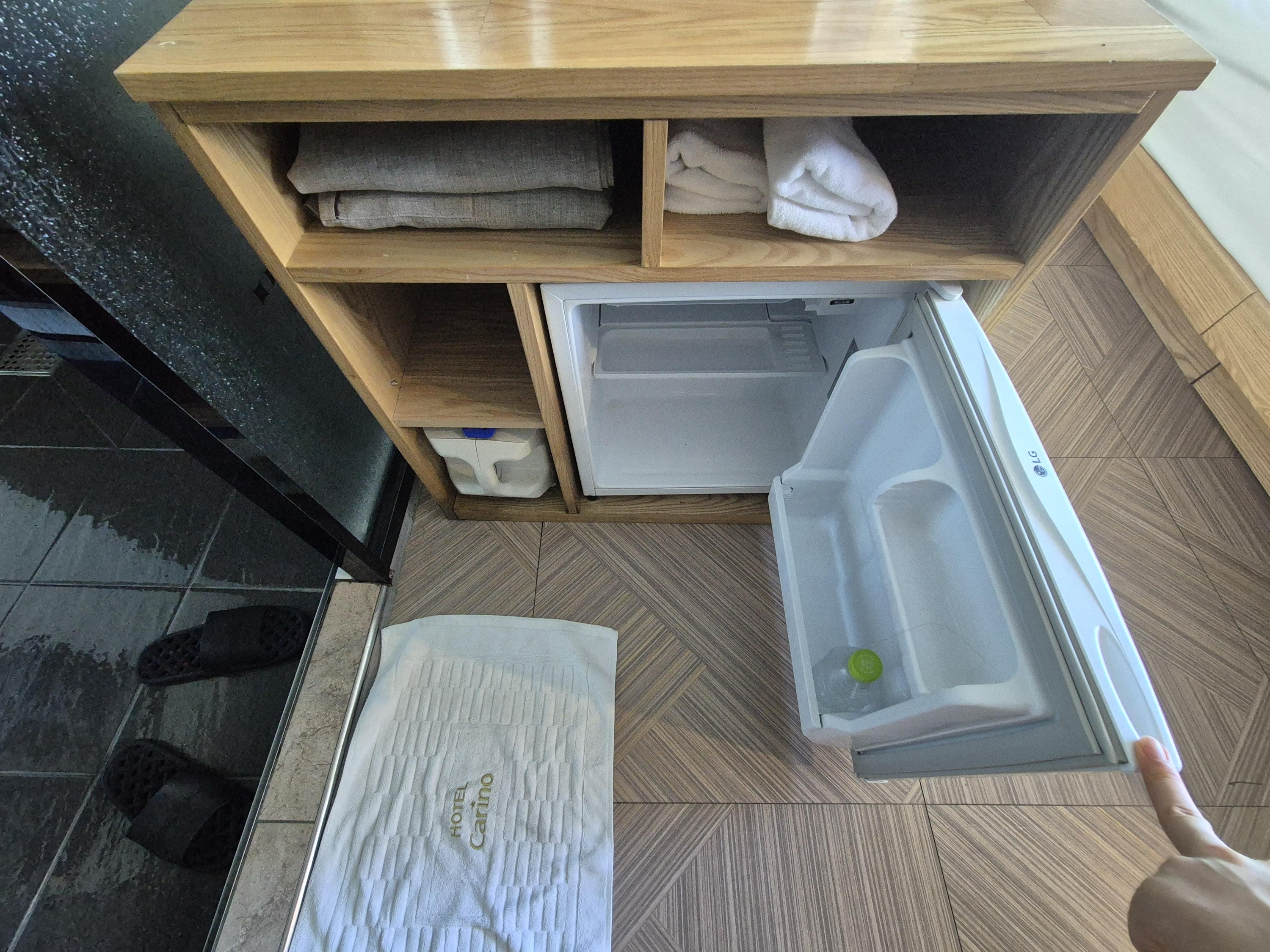 발 닦는 용도의 수건과 실내화도 두켤레 준비되어 있었어요. 다른 블로그 글 숙박 후기 보니 음료수도 2개 들어있던데 저희 호실에는 없었어요. 아마 있었어도 안먹었을테지만요. 이건 숙소마다 조금씩 차이가 있나봐요.
