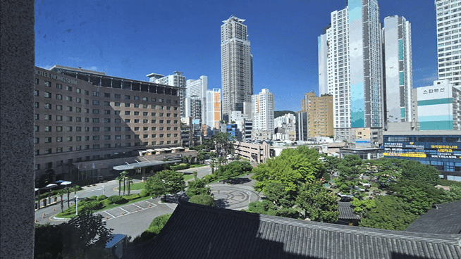미리 통유리창 뷰 먼저 보여드릴게요. 앞에 부산 동래구 온천장 농심 호텔이 보여서 좋던데, 막힌 것 없이 탁 트인 시야 덕분에 마치 여행온 것 같은 느낌이더라고요.