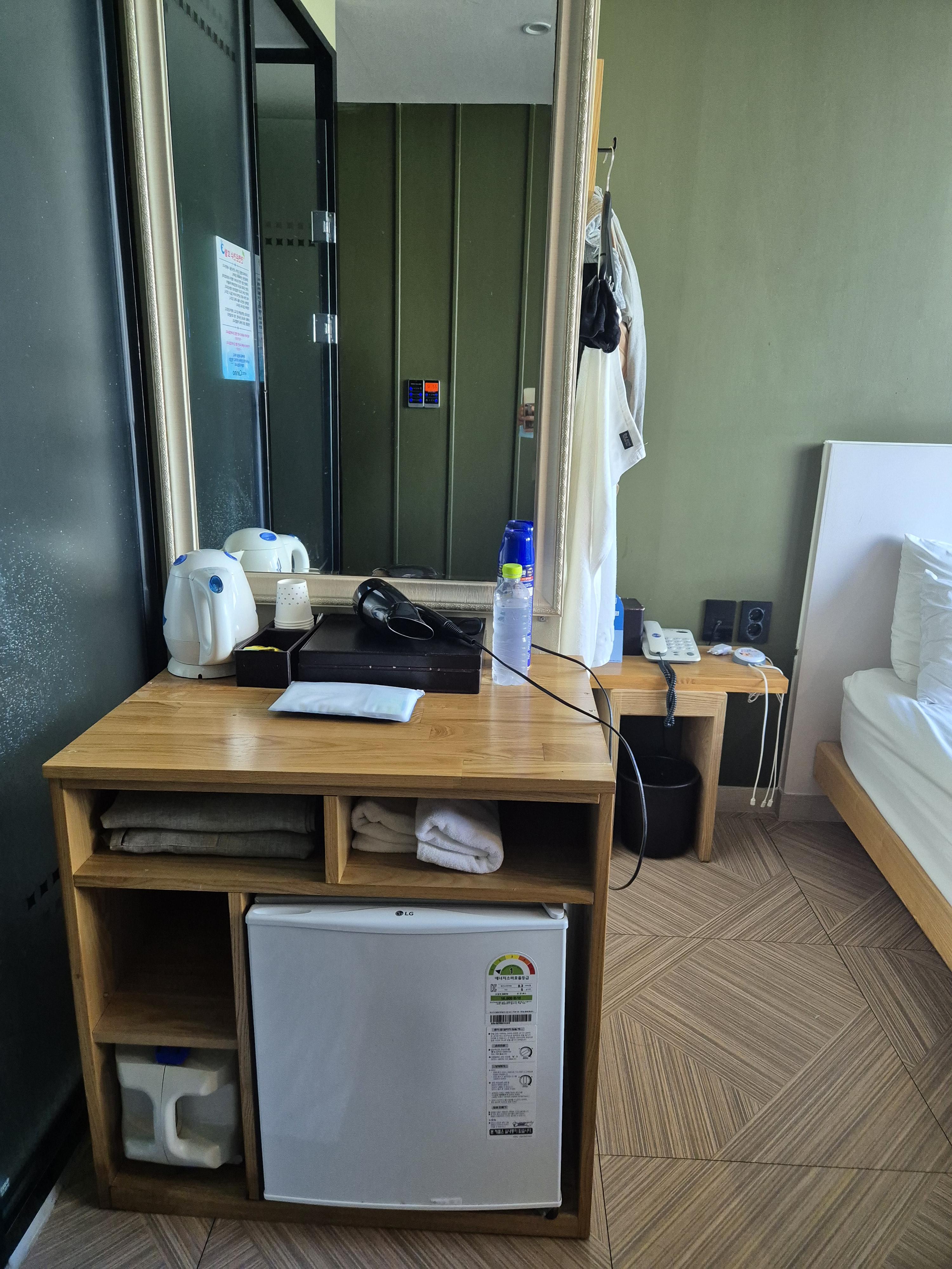 이렇게 큰 거울도 있고, 사용하지는 않았던 전기포트와 에프킬라, 커피 및 차, 유용하게 활용했던 종이컵, 헤어드라이기, 가운이 있었어요. 미니 냉장고에는 생수 2병이 들어있더라고요. 혹시나 물이 모지라면 안내데스크 있는 3층으로 가면 정수기 물을 온수 냉수로 이용할 수 있고, 커피도 전자렌지도 활용할 수 있으니 참고해주세요.