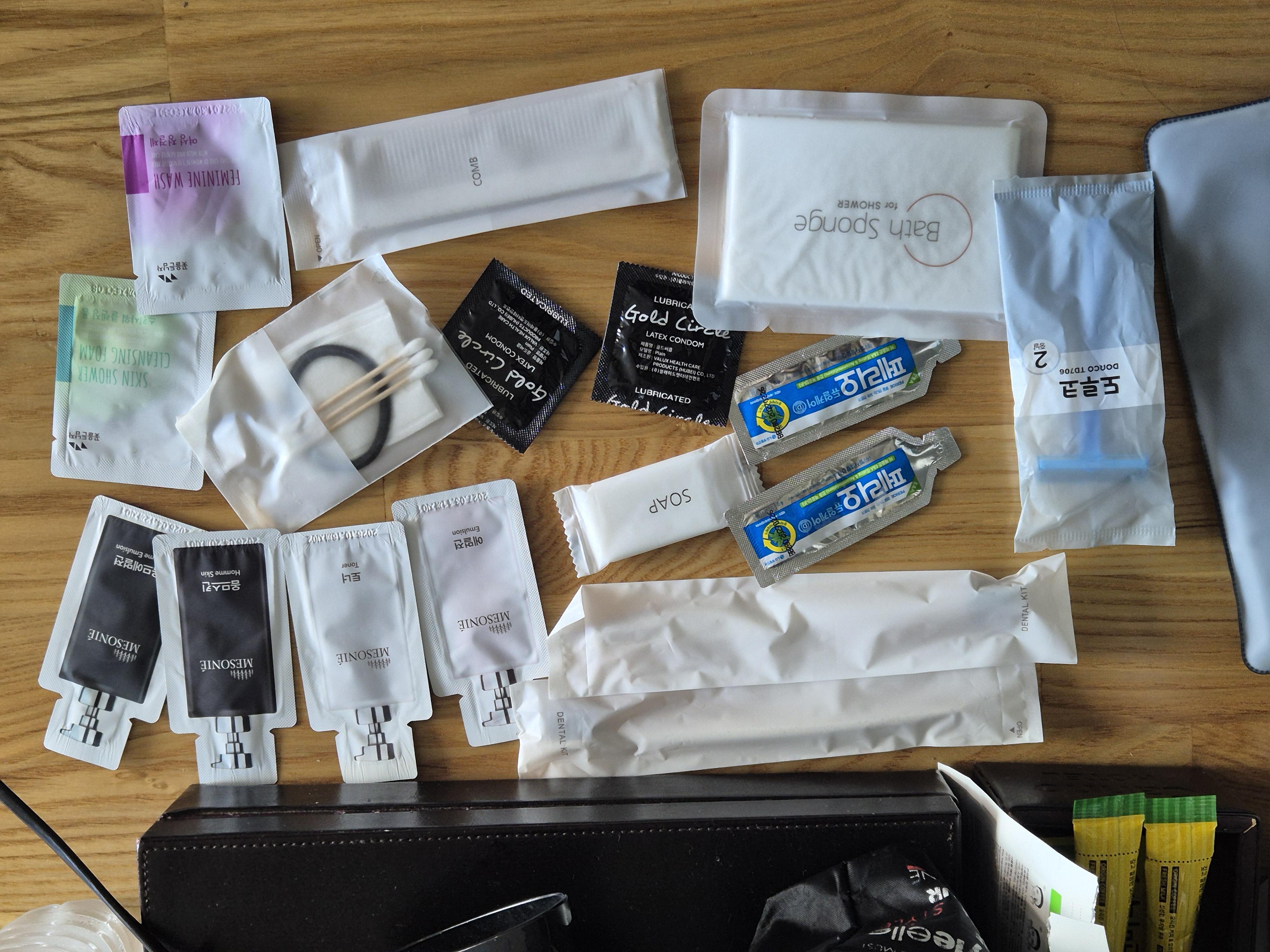 부산 동래 온천동 모텔에서 주는 어메니티 파우치에는 이렇게 칫솔 치약 비누 샤워숍 빗 면도기 면봉 솜 머리끈이 있어 좋더라고요.