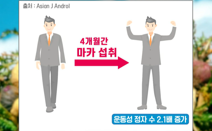 4개월간의 블랙마카 섭취 임상실험 결과 남성의 운동성 정자 수가 2.1배 정도 증가하는 등 남성의 활력이 유의미하게 개선됐음을 확인한 논문도 있습니다.