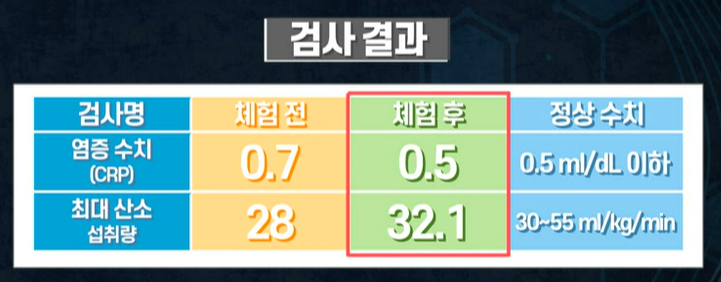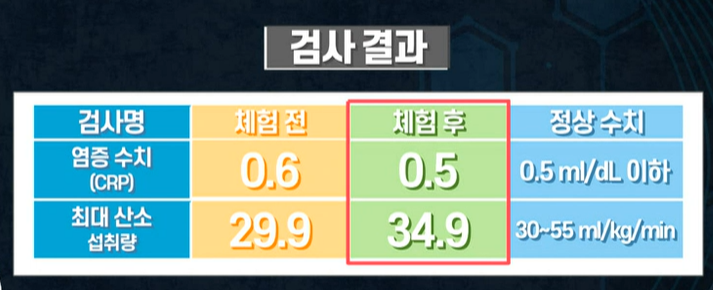 다른 참가자 또한 마찬가지. 비교적 낮았던 면역 수치도 높아졌고 최대 산소 섭취량도 이전에 비해 좋아졌음을 확인할 수 있었습니다.