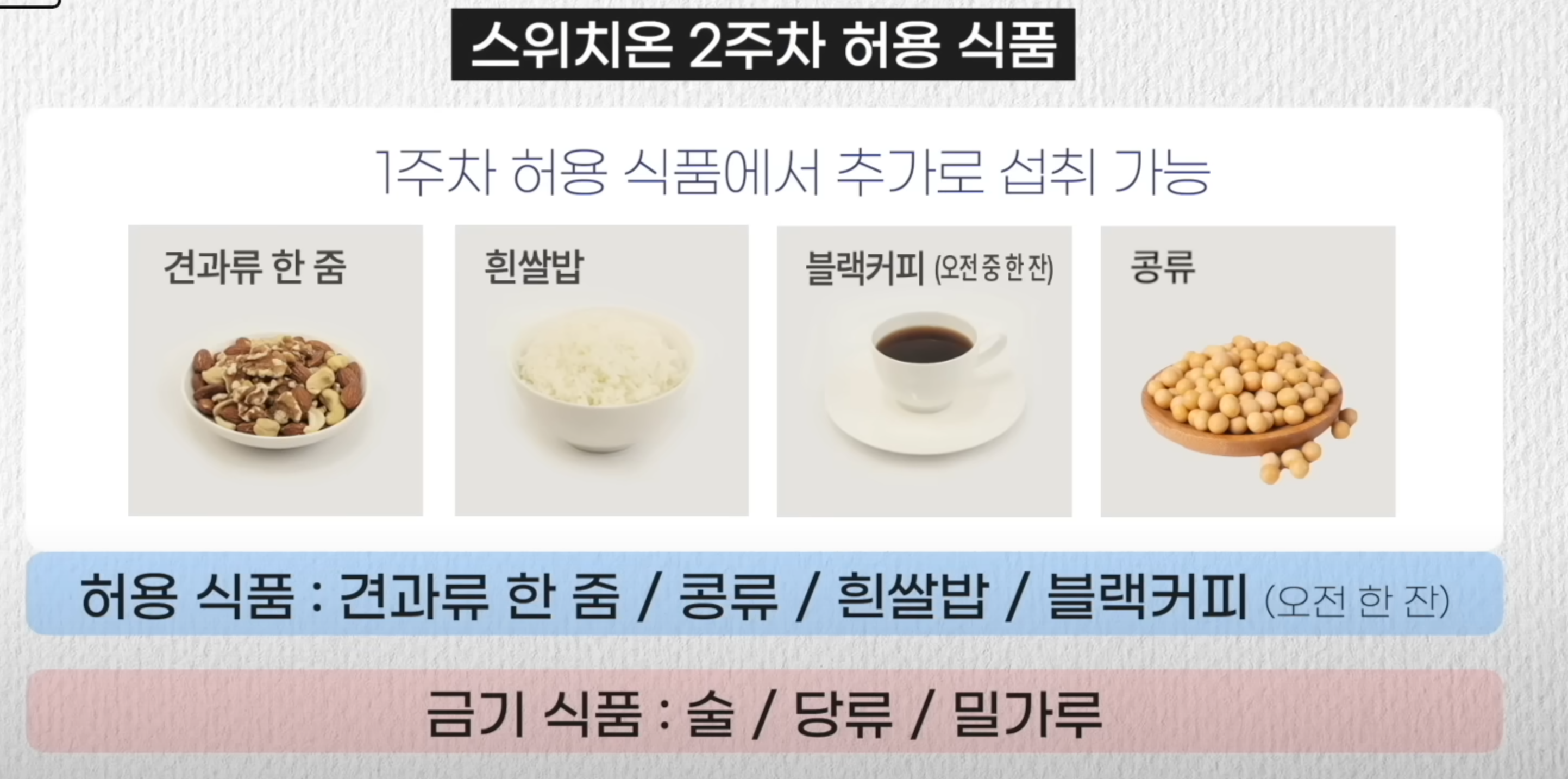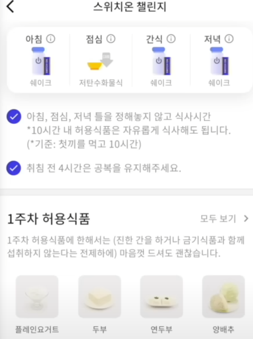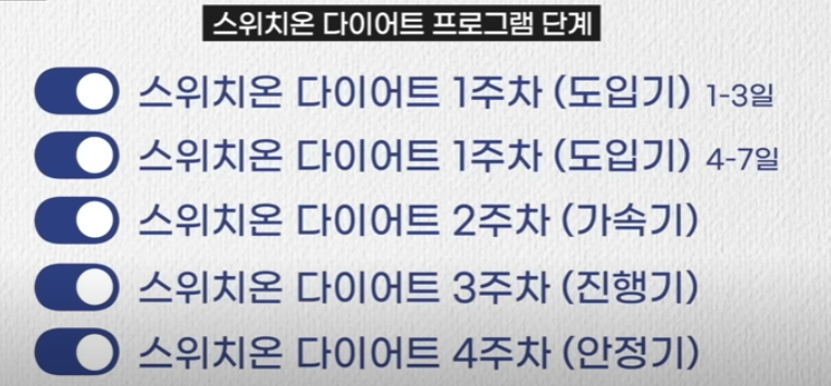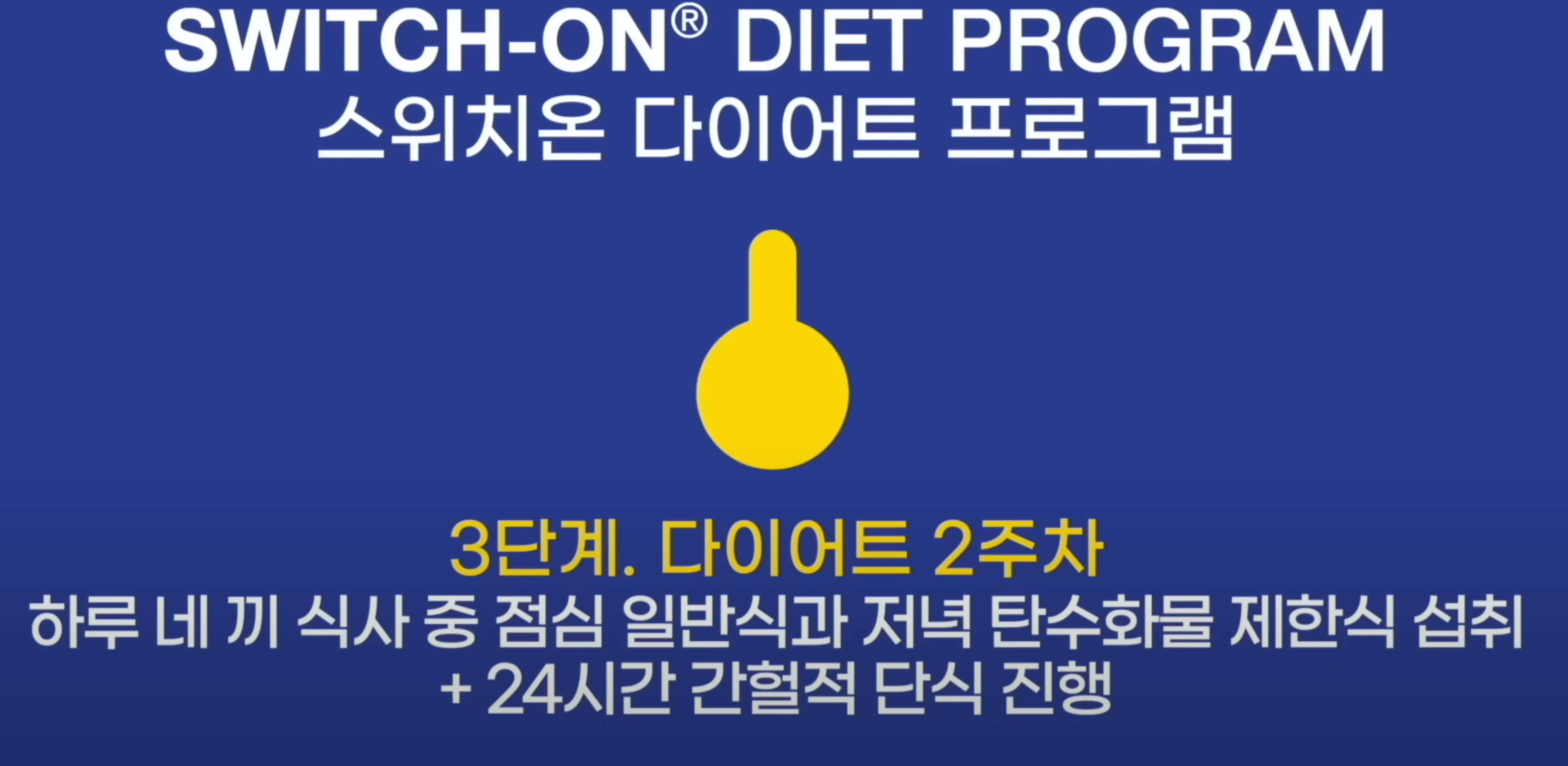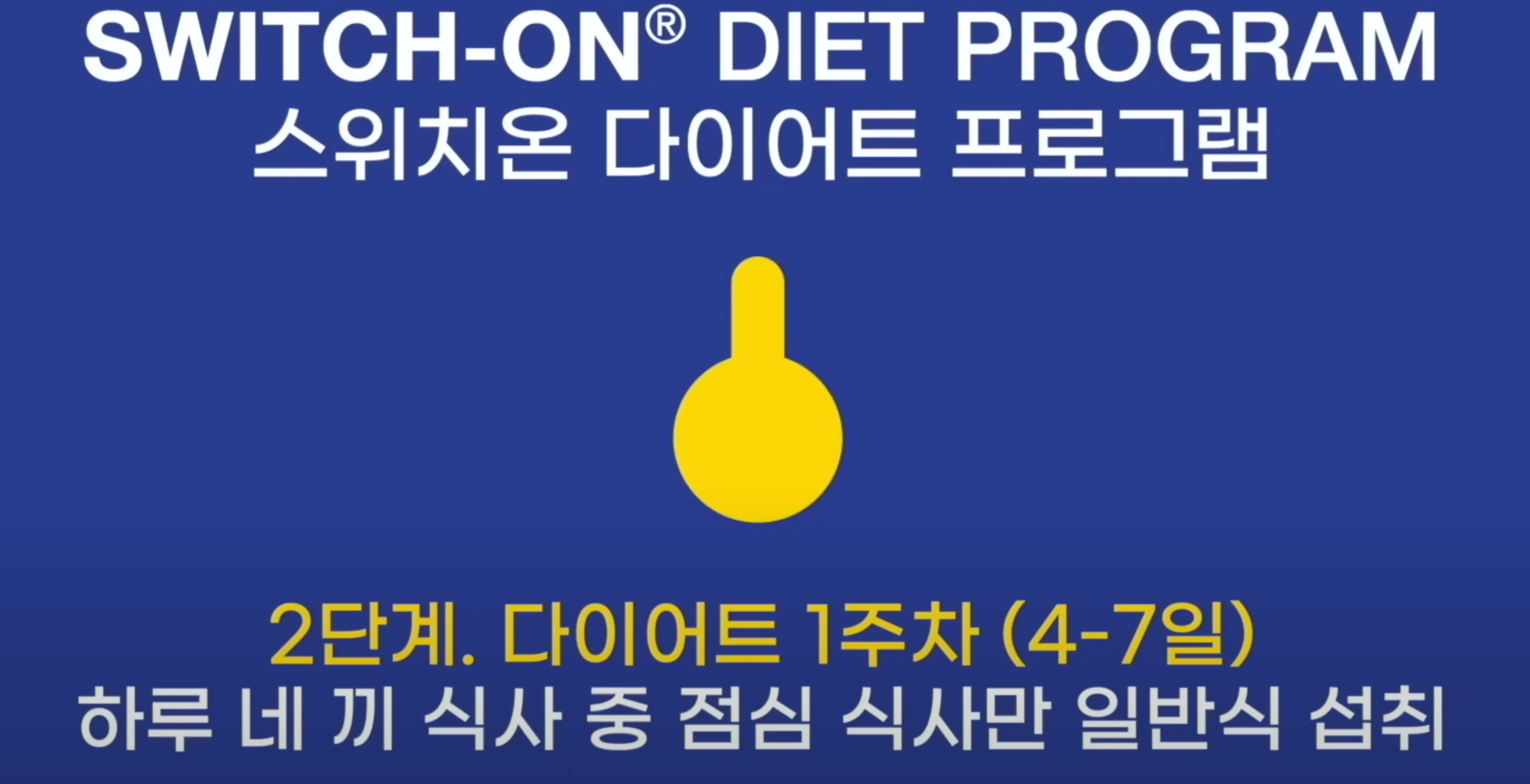 스위치온 다이어트는 4주 동안 진행되는 프로그램으로, 식단 조절과 운동을 통해 몸의 대사 방식을 바꾸는 것이 핵심이에요. 첫 번째 주에는 주로 단백질 쉐이크를 섭취하면서 몸을 지방을 잘 쓰는 상태로 만들고, 이후 단계에서 일반식을 다시 도입하는 방식이죠.