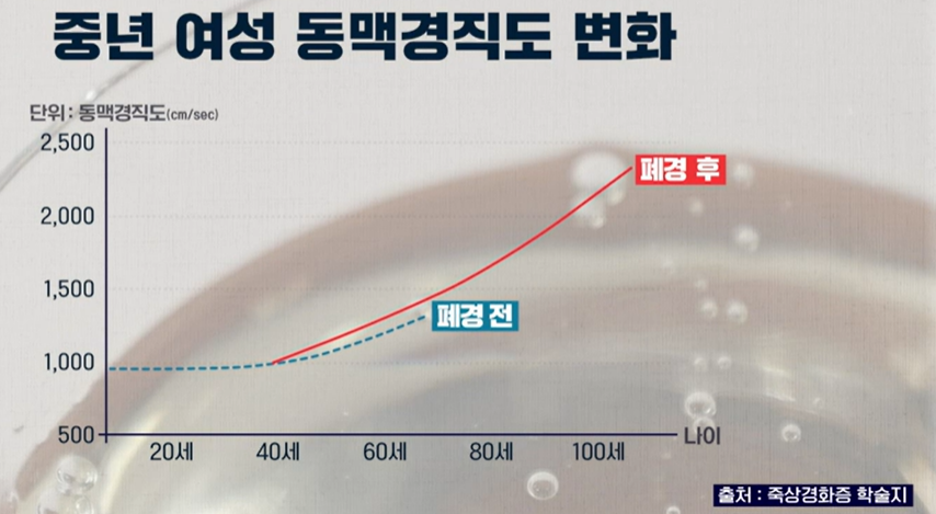 특히 중년 여성들의 혈관 탄력도는 매우 중요한데, 갱년기 이후 중년 여성은 여성호르몬이 감소되기 때문에 대부분 좋은 콜레스테롤은 감소하고 나쁜 콜레스테롤은 증가하게 됩니다. 또한 혈관벽을 유지하는 탄력도와 혈액의 농도 조절 기능 및 모든 유익한 작용이 급격하게 떨어지게 됩니다. 이렇게 되면 동맹경직도가 증가하게 되어 동맥경화의 위험이 높아집니다.