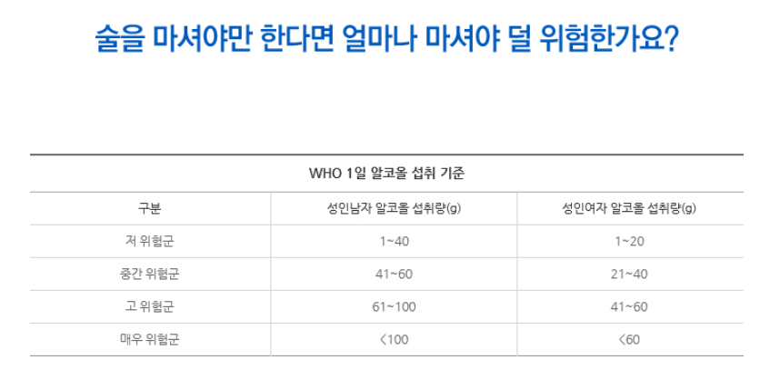 일일 적정 알코올 섭취량은 남성이 40g(약 소주 4잔), 여성이 20g(약 소주 2잔) 미만입니다. 음주는 소량이라도 정신적, 육체적 많은 해로움을 끼칠 수 있으므로 술자리는 되도록 피하고 당당하게 술을 거절하는 것도 중요하니 참고하시기 바랍니다.