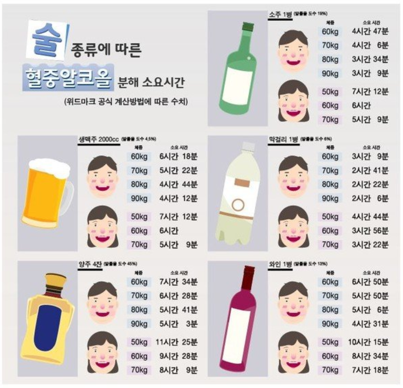 혈중 알코올 분해 소요시간은 술 종류에 따라 다른데 위 사진을 참고하시면 알코올 분해 시간에 대해 참고하실 수 있습니다.