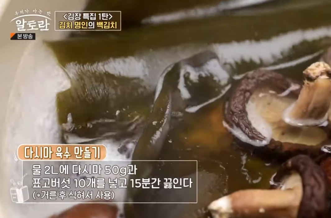 물 2L에 다시마 50g과 표고버섯 10개를 넣고 15분간 끓입니다. 그런 다음 재료를 걸러내고 식혀주세요. 이 육수는 백김치의 풍미를 한층 더해줄 거예요. 🍄