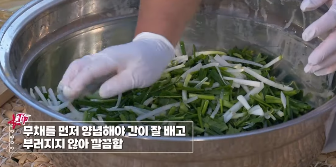 이제 무는 새우젓 국물 1큰술과 멸치액젓 1큰술을 넣고 간을 한 후, 손질한 쪽파와 청갓을 넣고 버무립니다. 마지막으로 스테비아 1큰술, 다진마늘 1큰술, 풀국 2컵을 넣고 잘 섞어주세요. 이렇게 하면 맛있는 김치소가 완성됩니다! 🎊