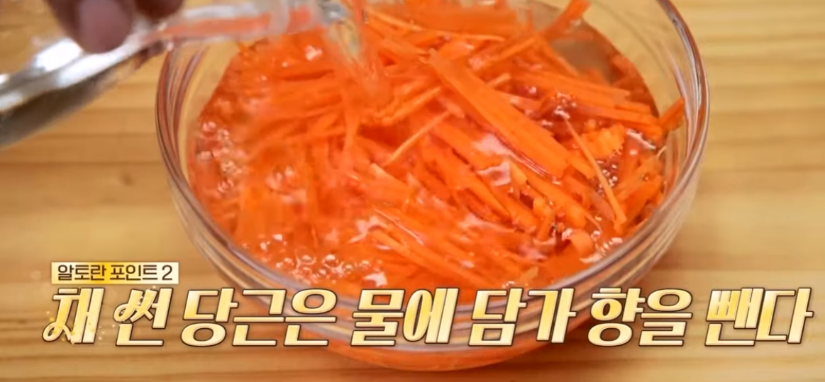 당근 손질: 채썬 당근은 물에 약 2시간 담가 향을 빼고, 채반에 밭쳐 준비합니다.