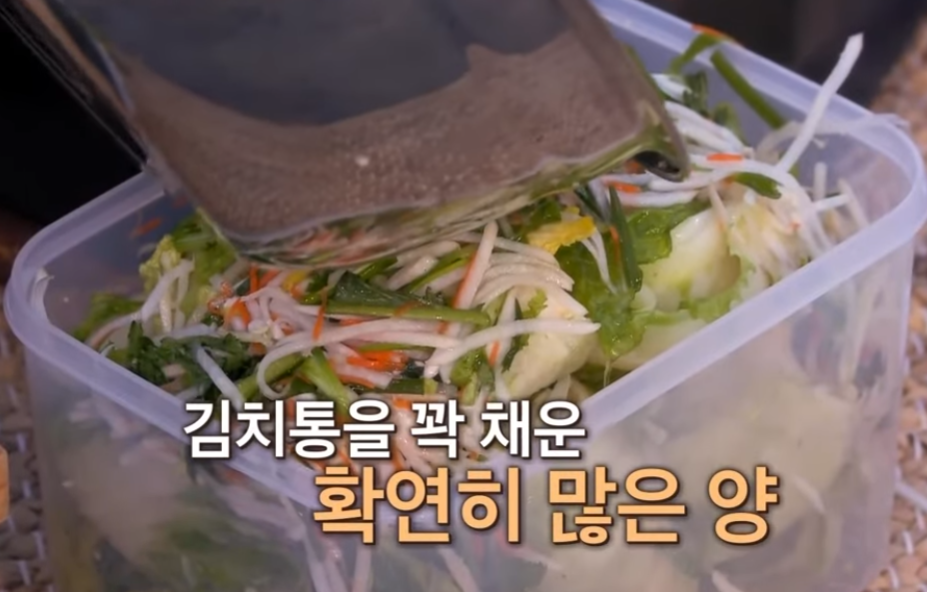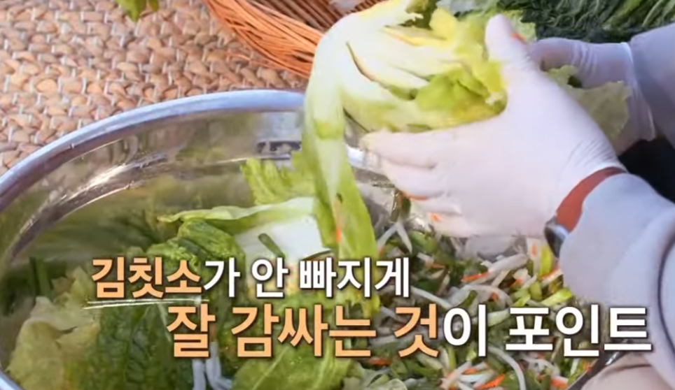 절인 배추 사이사이에 김치소를 넣고 반으로 접은 후 겉잎으로 감싸서 김치통에 넣습니다.