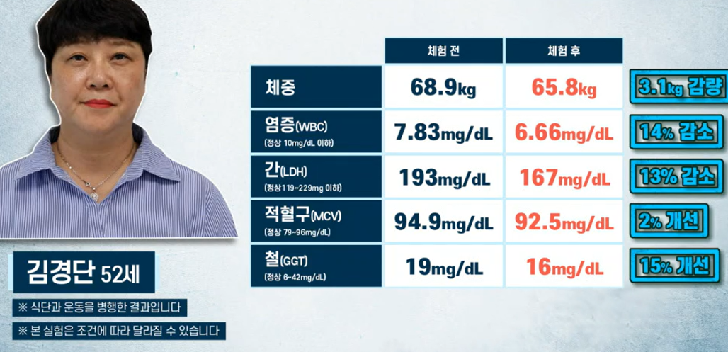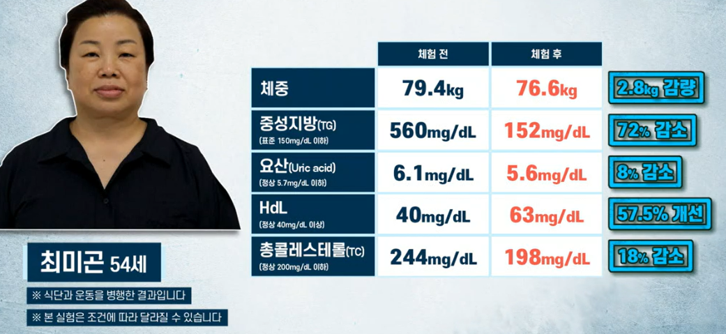 김경단 씨는 체중 3.1kg이 감량되면서 대사 질환을 유발할 수 있는 염증 수치가 감소했고, 최미곤 씨도 체중이 2.8kg 줄면서 종양을 유발할 수 있는 중성지방과 총 콜레스테롤 수치가 내려갔습니다.