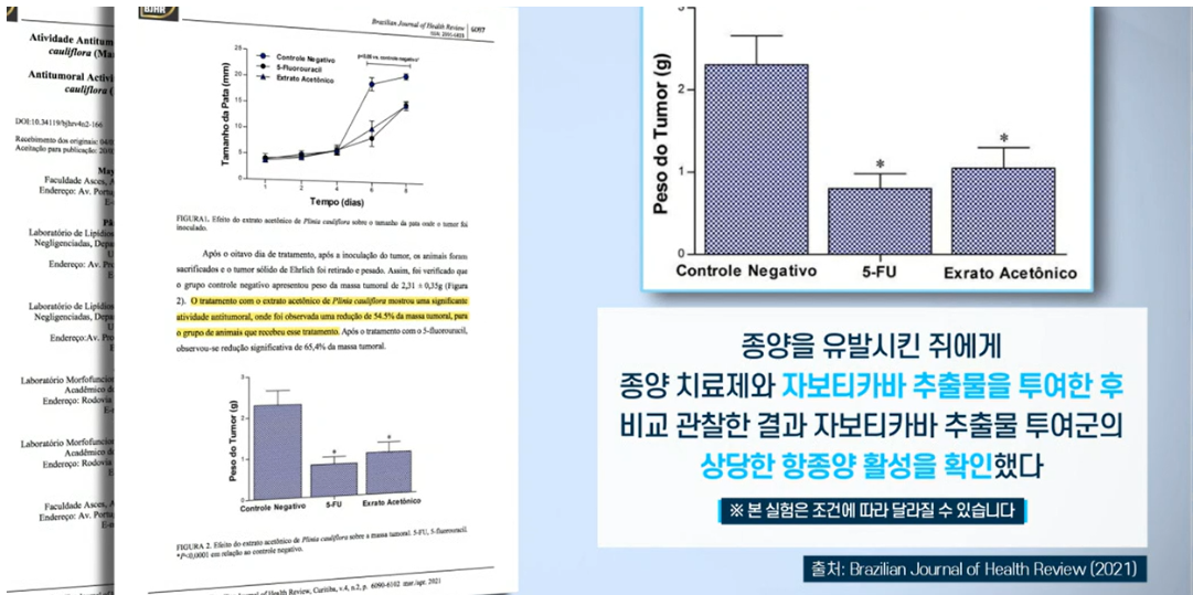 실제 종양을 유발한 두 그룹의 동물에게 각각 자보티카바 추출물과 종양 치료제를 투여했더니, 자보티카바 추출물을 투여한 그룹에서 종양의 성장이 억제되고 줄어든 것을 확인할 수 있었습니다.