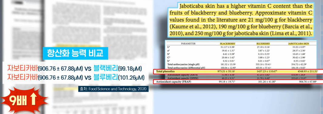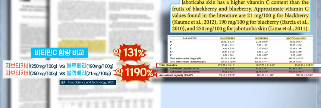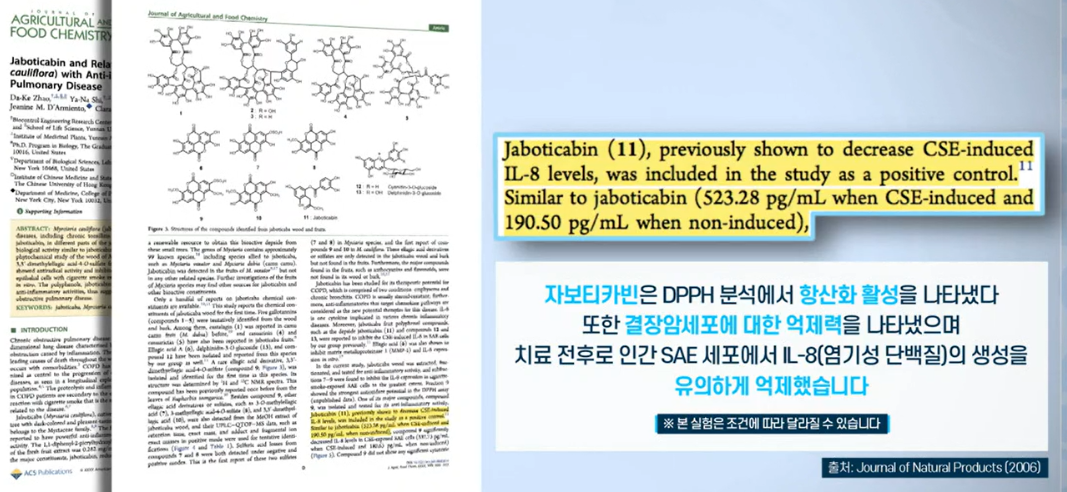 자보티카바에서 최초로 발견된 항산화 성분인 '자보티카빈'은 염증 유발 수치를 81.3% 낮추고, 결장암세포를 억제하는 데 도움을 줬다는 연구 결과가 있습니다.