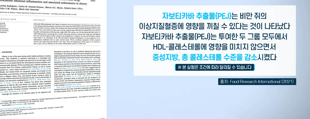 한 연구 논문에서는 자보티카바 추출물이 중성지방, 총 콜레스테롤 개선에 도움을 준 것으로 보고되었습니다. 또 자보티카바는 블루베리와 비교했을 때 적은 양을 섭취해도 간암 세포의 억제에 도움이 되었다는 연구 결과도 있습니다.