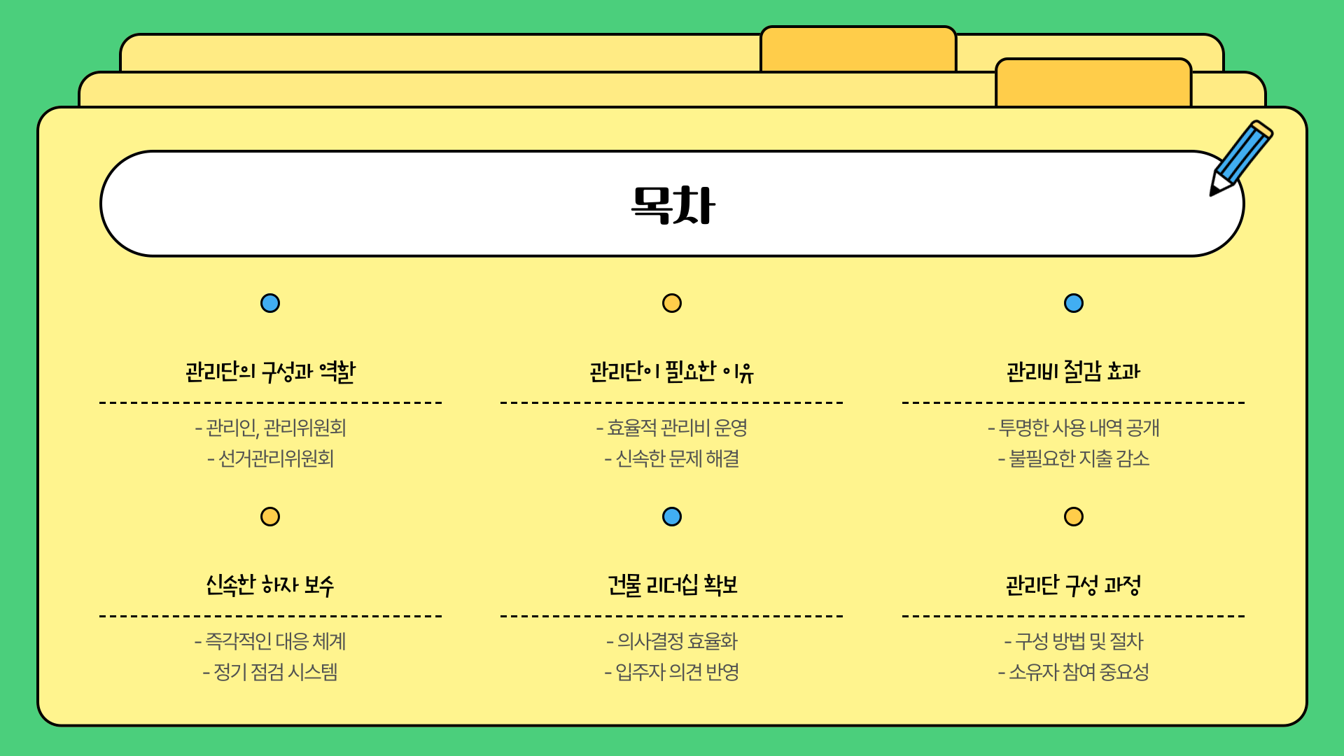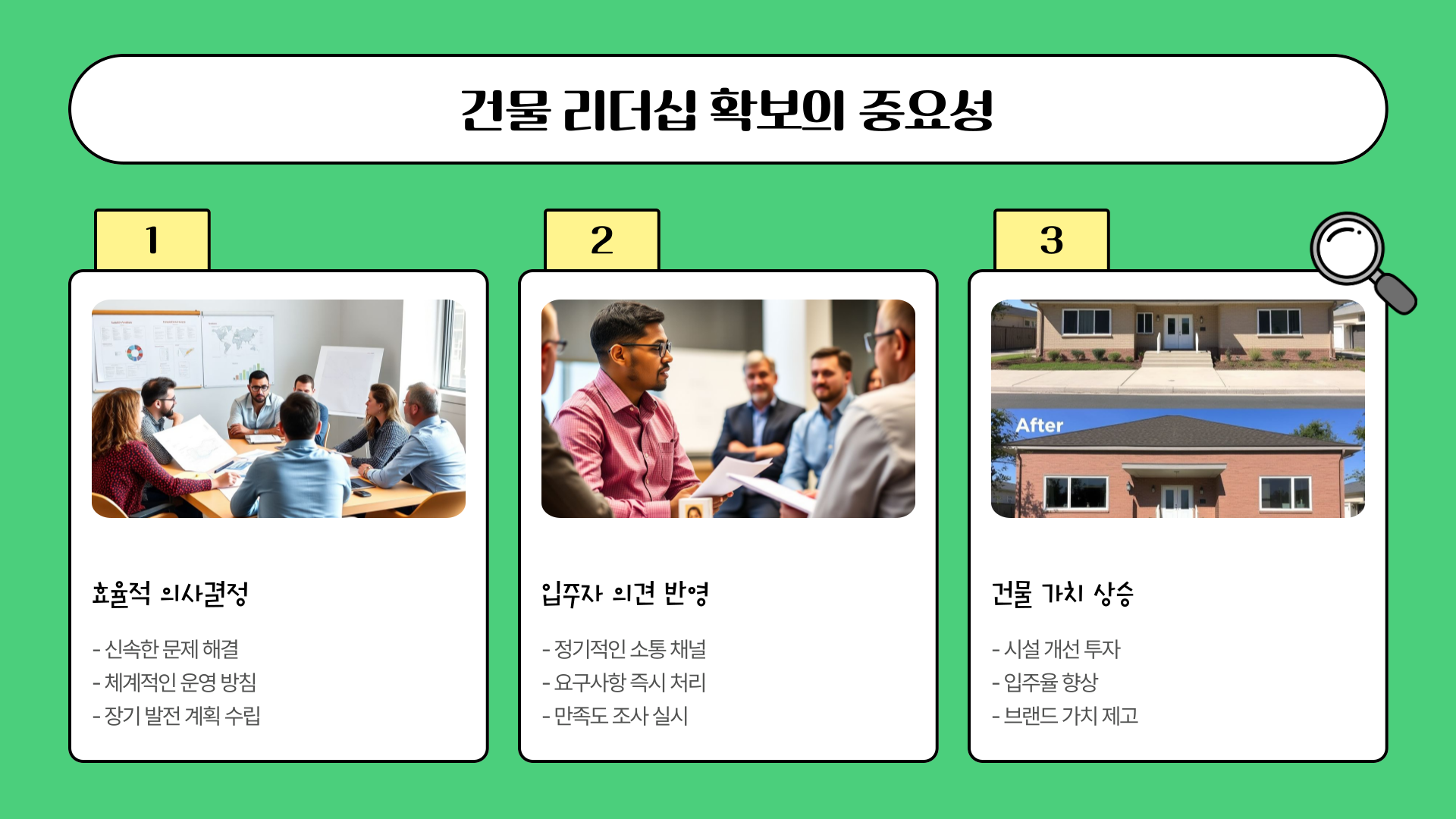 리더십이 없는 건물은 결국 관리가 무너져 내릴 수밖에 없습니다. 관리단은 건물 운영에 대한 방향성을 제시하고, 입주자들의 의견을 반영하여 건물의 가치를 높이는 데 큰 역할을 합니다.
