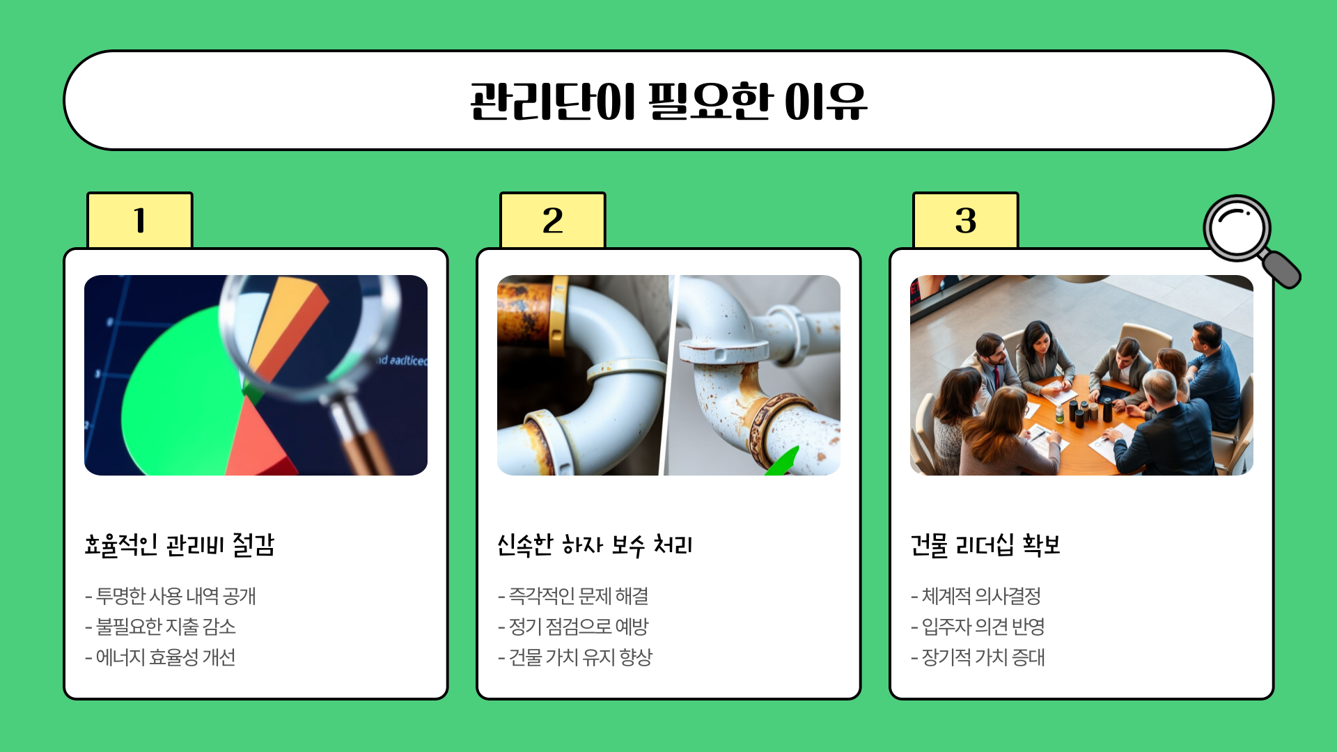 관리단은 지식산업센터와 같은 집합건물의 효율적인 운영에 필수적입니다. 관리비 절감, 신속한 하자 보수, 그리고 건물 리더십 확보 등 여러 장점이 있죠. 이러한 이유로 관리단이 빠르게 구성되는 것이 중요해요.