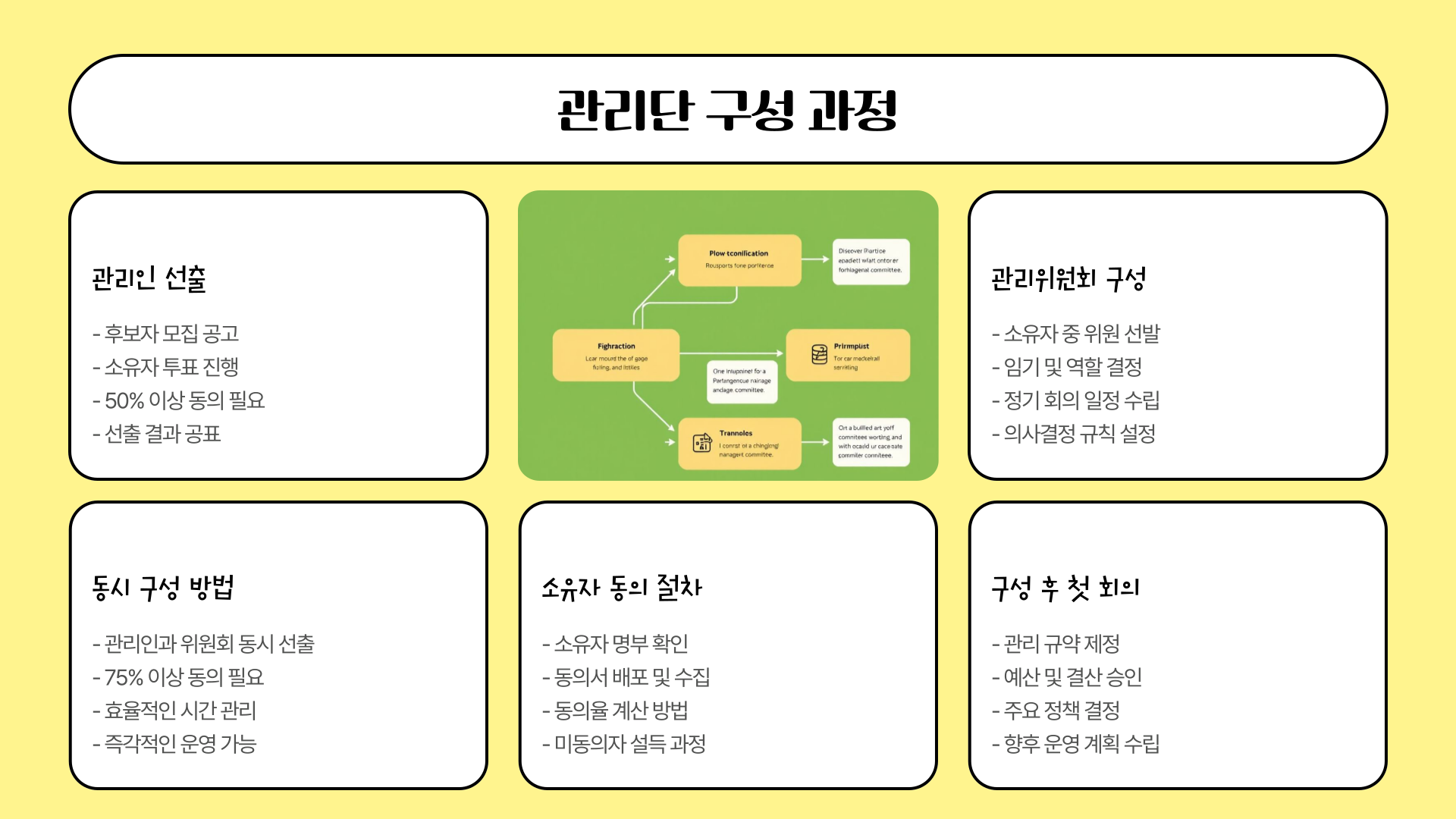 관리단을 구성하는 과정은 여러 가지 방법이 있어요. 첫 번째 방법은 관리인을 먼저 선출하고 그 후에 관리위원회를 구성하는 거예요. 이 경우, 소유자들의 동의가 필요하고, 50% 이상의 동의를 받아야 관리인이 선출될 수 있습니다.