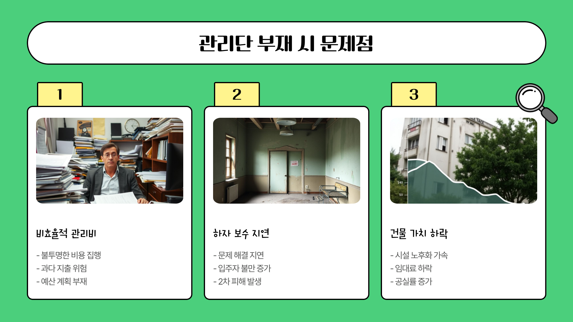 관리단이 없으면 여러 문제가 발생할 수 있어요. 관리비가 비효율적으로 사용되고 하자 보수가 지연되면서 결국 건물의 가치가 하락하게 됩니다. 이러한 상황은 입주자와 소유자 모두에게 부정적인 영향을 미칠 수 있죠.