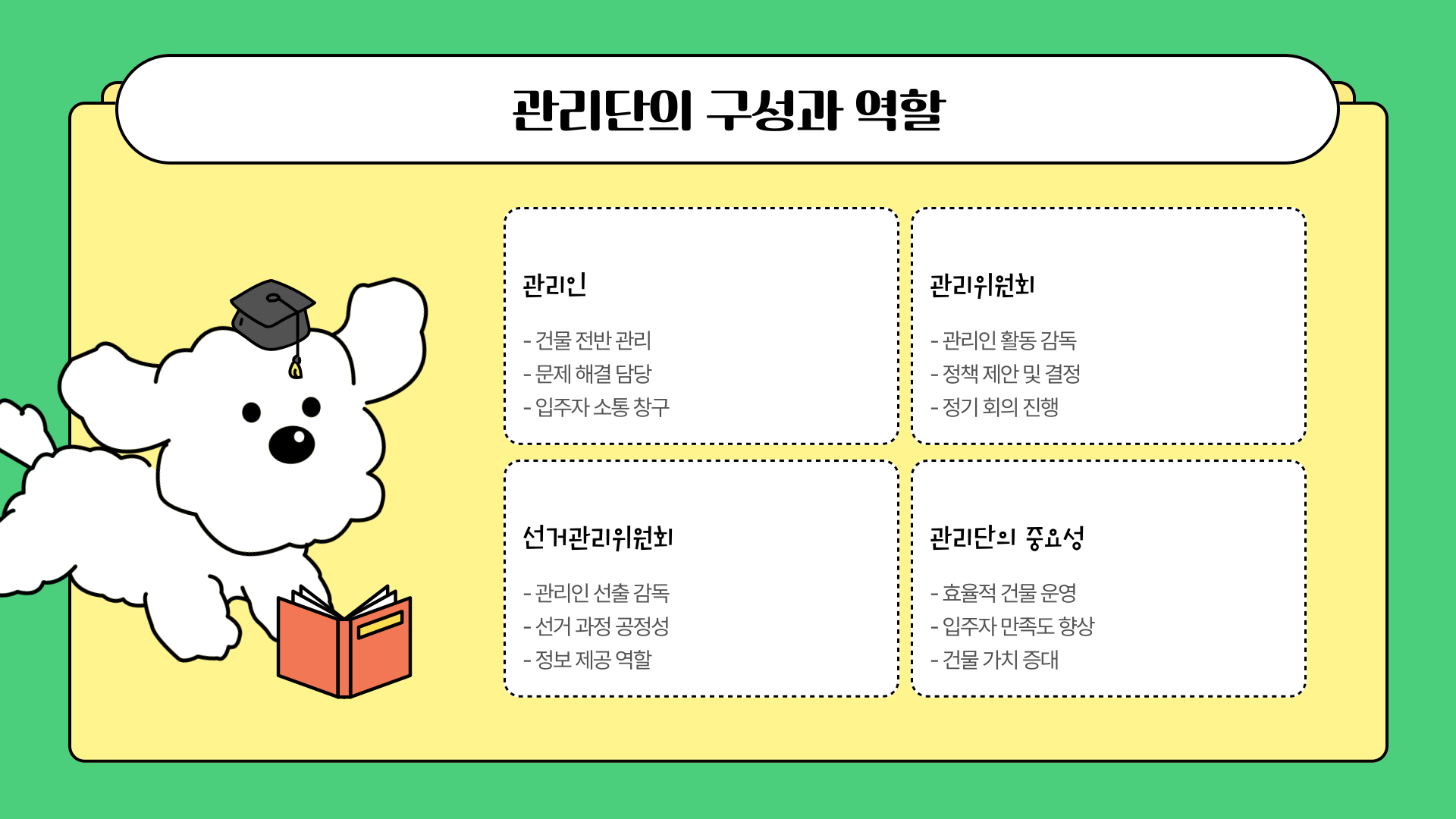 관리단은 건물의 원활한 운영을 보장하기 위해 꼭 필요한 조직이에요. 주로 관리인, 관리위원회, 그리고 선거관리위원회(선관위)로 구성되며, 각 구성원은 서로 다른 역할을 맡고 있습니다.