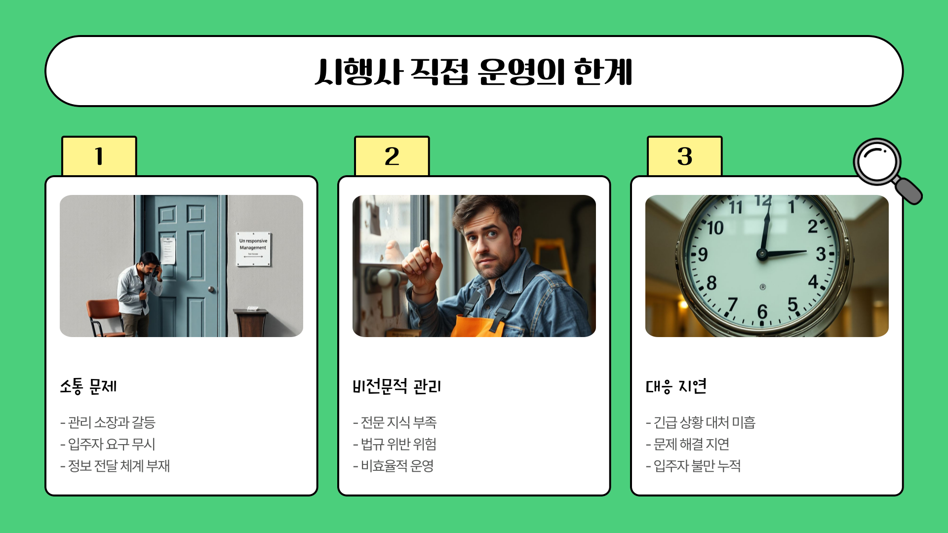 더욱이, 시행사가 직접 운영하게 될 경우, 관리 소장이나 관리 업체와의 원활한 커뮤니케이션이 이루어지지 않을 수 있습니다. 이로 인해 비전문적인 관리가 이루어질 가능성이 높아지죠. 예를 들어, 관리 소장이 상주하지 않는 경우, 문제 발생 시 즉각적인 대응이 어려워져 상황이 악화될 수 있습니다.