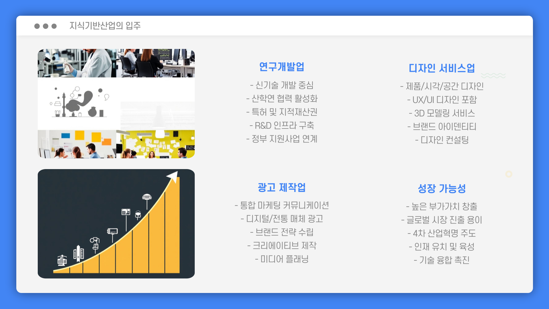 다음으로 지식기반산업입니다. 이 업종은 창의적인 정신 활동을 통해 고부가가치의 지식 서비스를 창출하는 분야를 의미해요. 연구개발업, 디자인 서비스업, 광고 제작업 등이 여기에 해당하죠. 최근에는 이러한 지식기반산업의 수요가 급증하고 있어요.